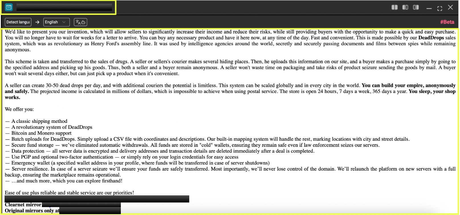 At the same time, the DeadDrop delivery model introduces a layer of physical-world interaction that distinguishes Bazaar from many traditional darknet marketplaces. This approach reflects an attempt to adapt operations in a way that reduces reliance on conventional distribution channels.