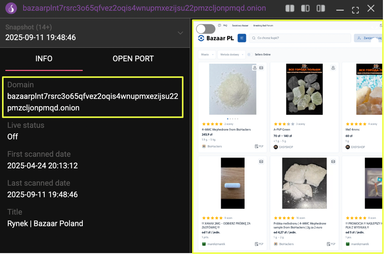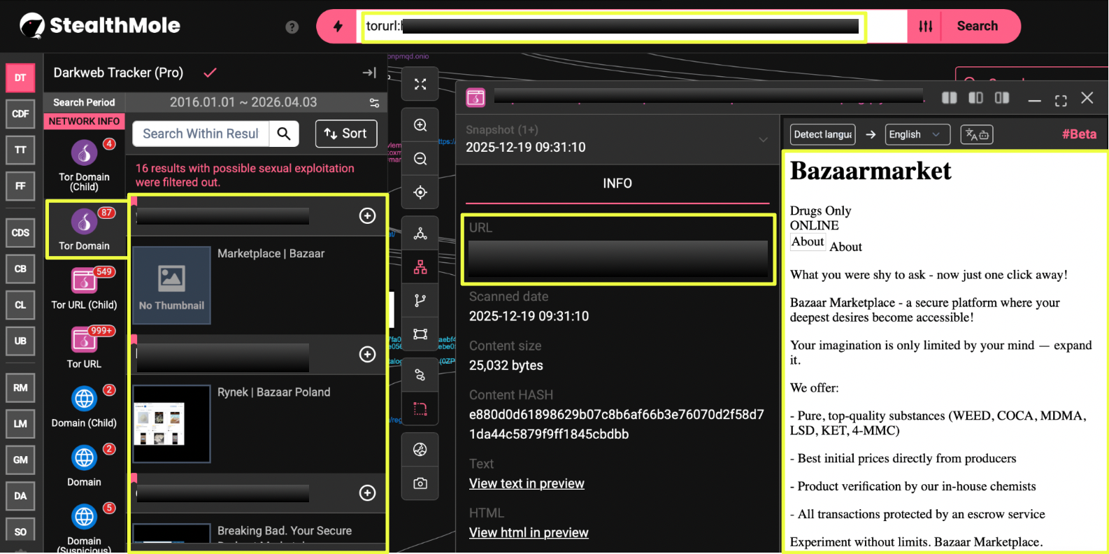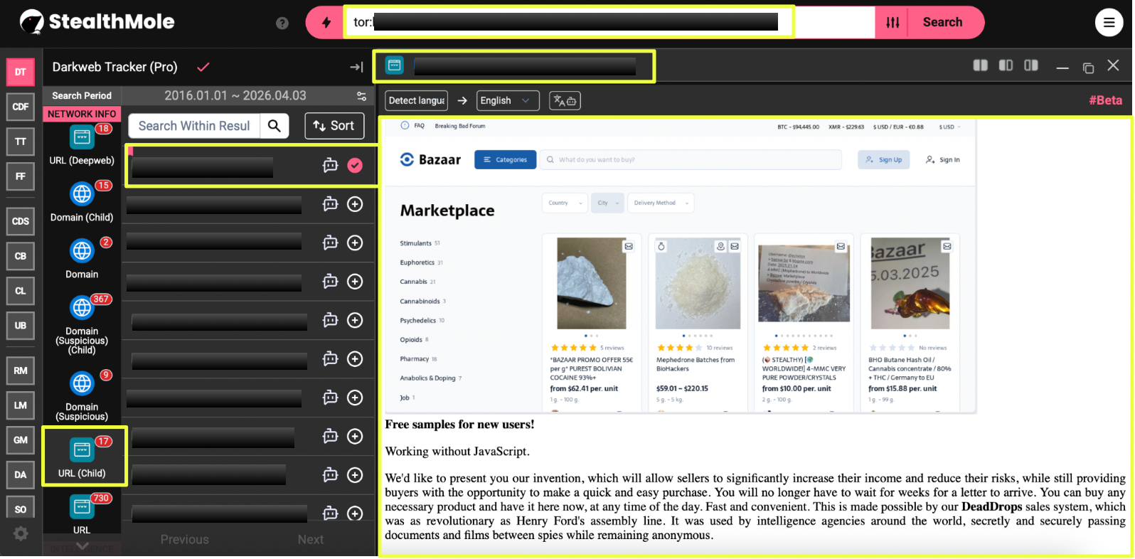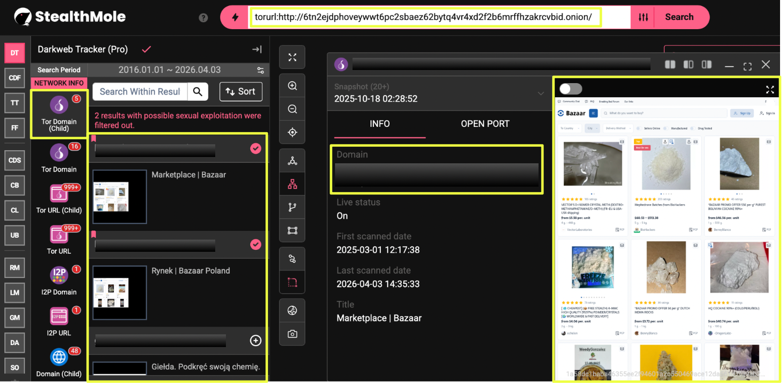 After establishing the primary marketplace, the investigation focused on identifying additional access points linked to Bazaar. This was done using StealthMole’s Dark Web Tracker, which revealed multiple domains associated with the platform across both clearnet and onion environments.