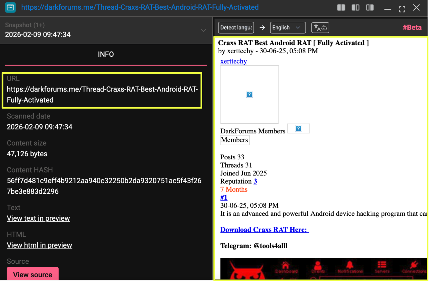 With this broader landscape in mind, the investigation began during routine monitoring of Android RAT activity. While reviewing discussions on DarkForums, a thread was identified: