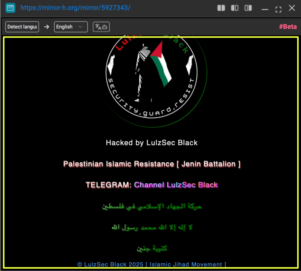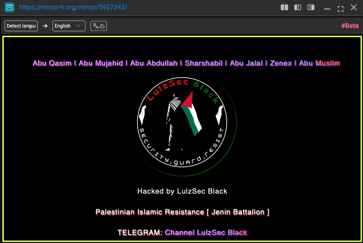 A review of entries on Mirror-H showed a defacement page attributed to “LulzSec Black.” The defaced page prominently displayed the group’s logo alongside pro-Palestinian imagery and explicit references to “Palestinian Islamic Resistance [ Jenin Battalion ].” The page also embedded Telegram links, reinforcing the pattern observed earlier, each operational act redirected attention back to their communication channels.