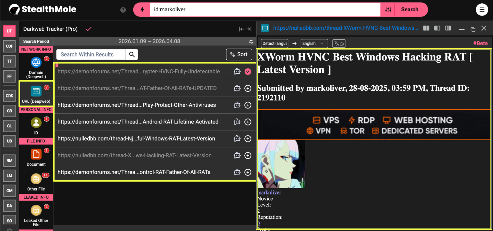 This introduced a new identity into the investigation. To understand whether this was a separate actor or connected activity, the username “markoliver” was queried in StealthMole’s Dark Web Tracker.