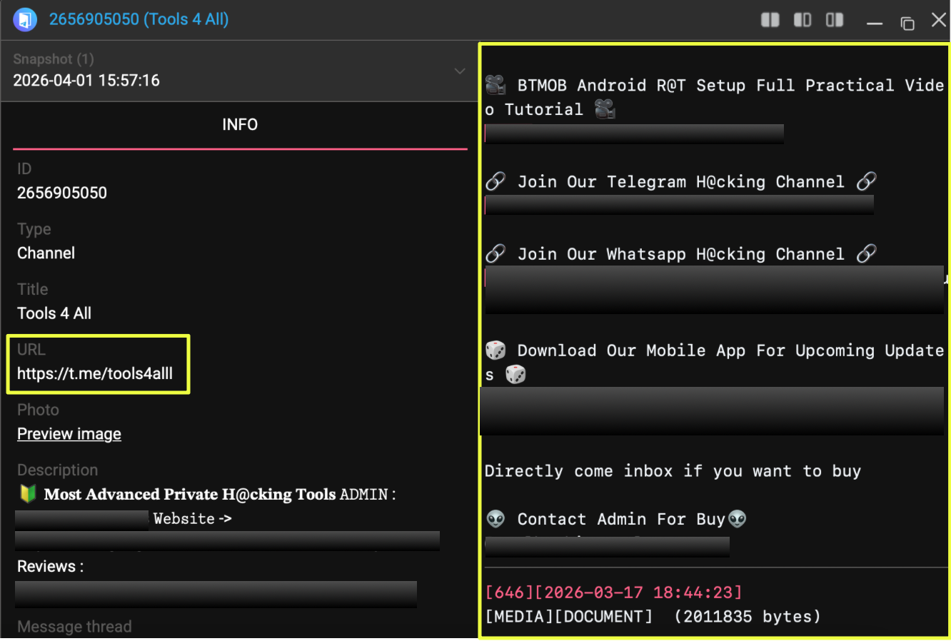 This introduced a second communication channel into the investigation, suggesting that the actor was not relying on a single point of contact. Whether this reflected multiple channels under the same control or a broader distribution setup was not immediately clear, but the overlap in behavior and posting style indicated a connection worth tracking.