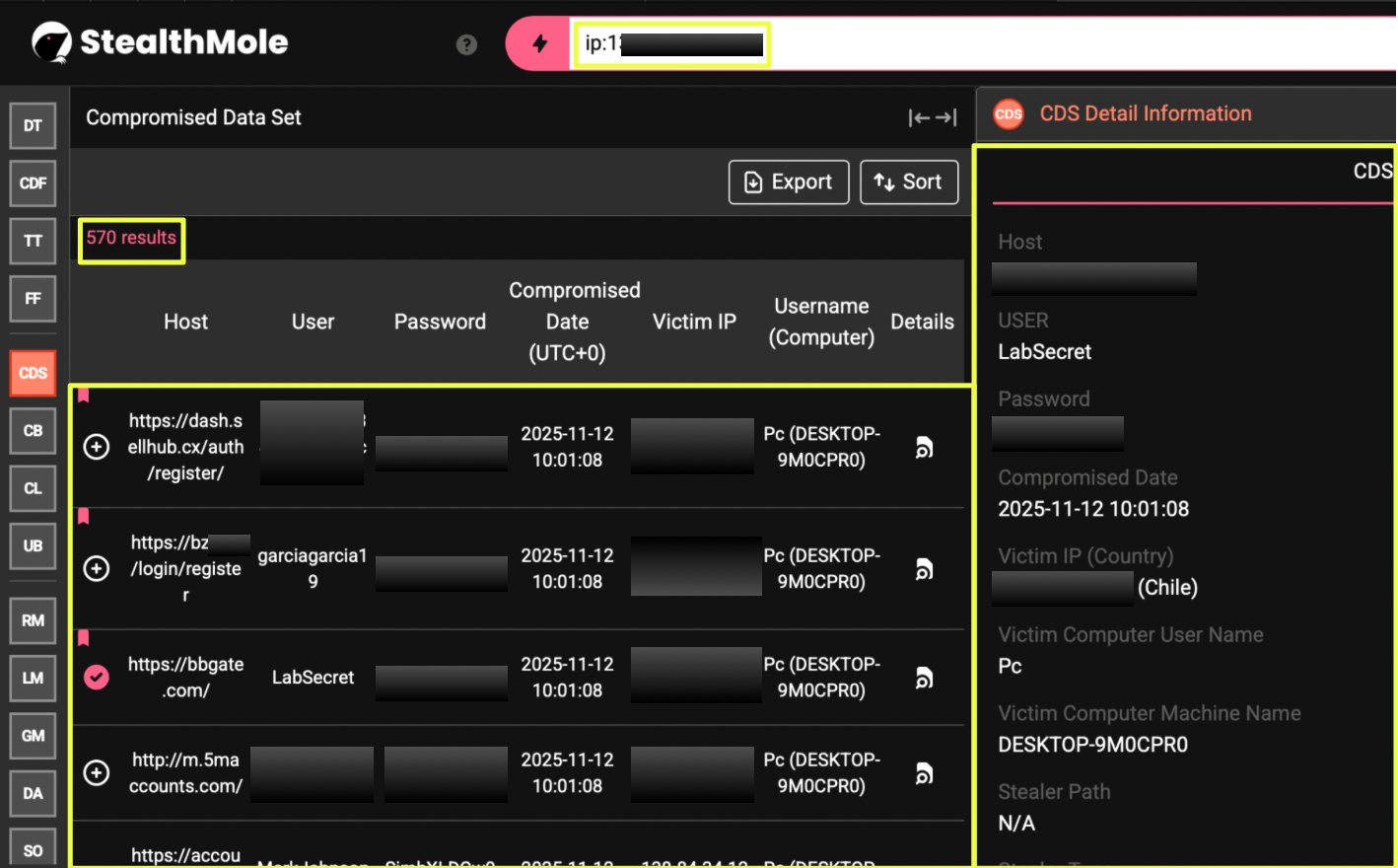 The same user appeared across multiple datasets, indicating repeated exposure of credentials. A further pivot on the IP address returned approximately 570 compromised records, suggesting that the system associated with this IP had been widely exposed.