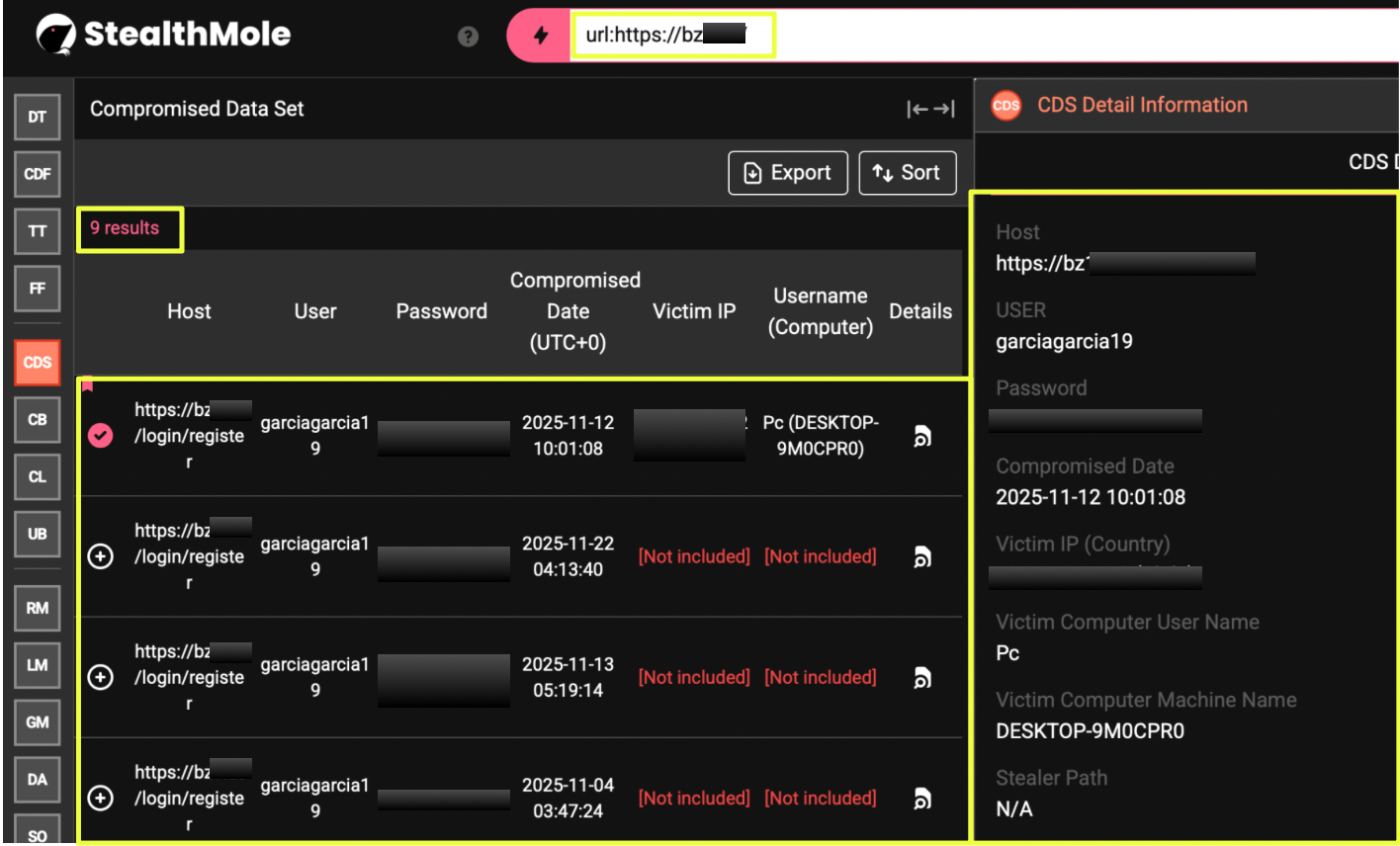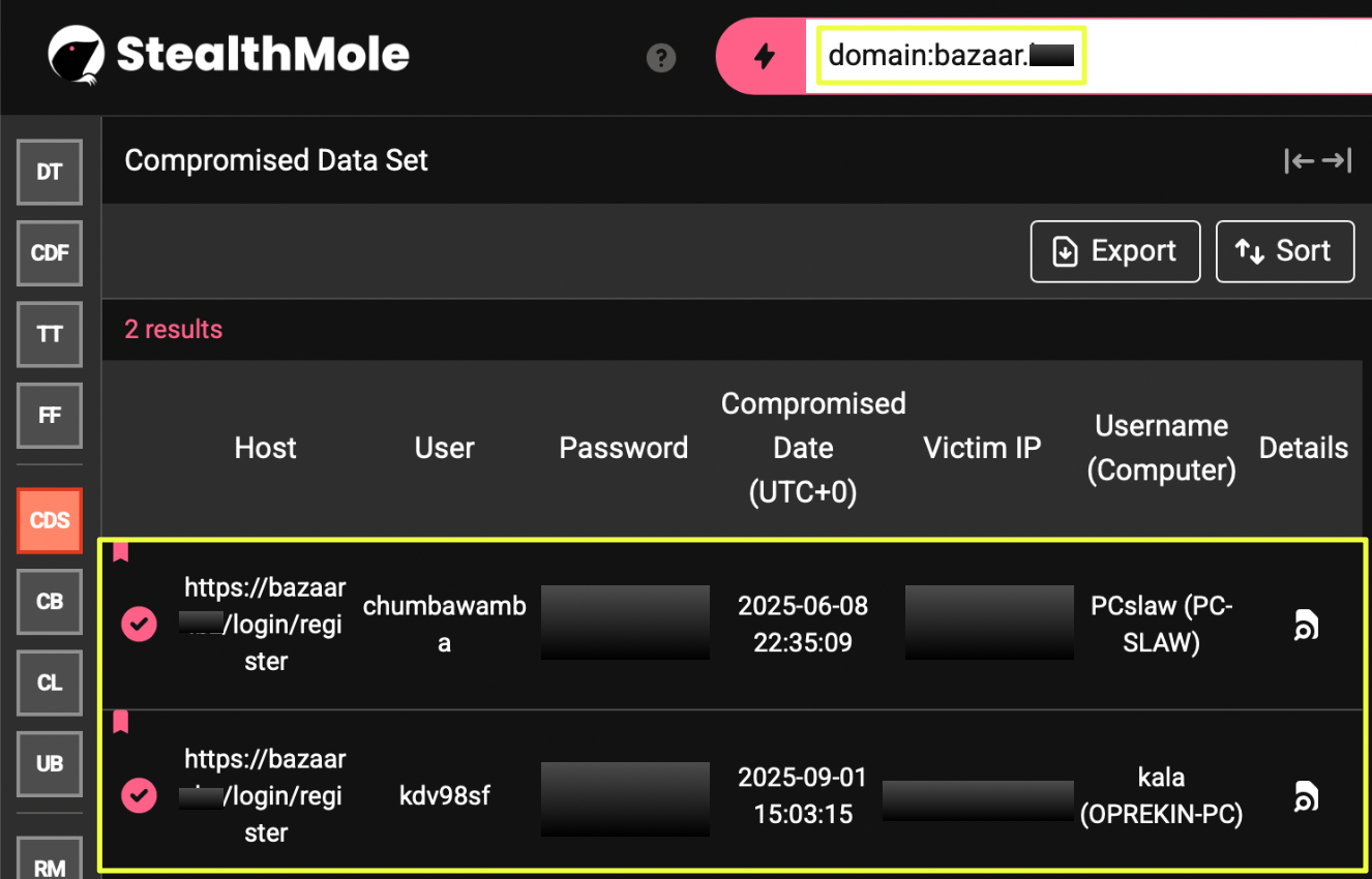 To understand how users interact with Bazaar-related infrastructure, the investigation shifted toward StealthMole’s Compromised Data Set and ULP Binder tools.
