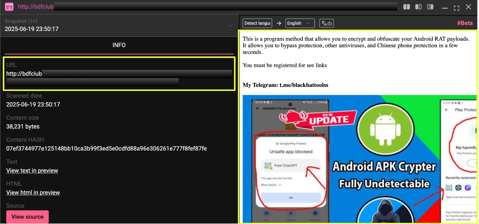 This thread, posted by “markoliver,” promoted an APK encryption method and included the same Telegram contact seen earlier. The presence of this activity on a Tor-based platform added another layer to the investigation, indicating that the same promotional approach was being used across both clearnet and dark web environments.