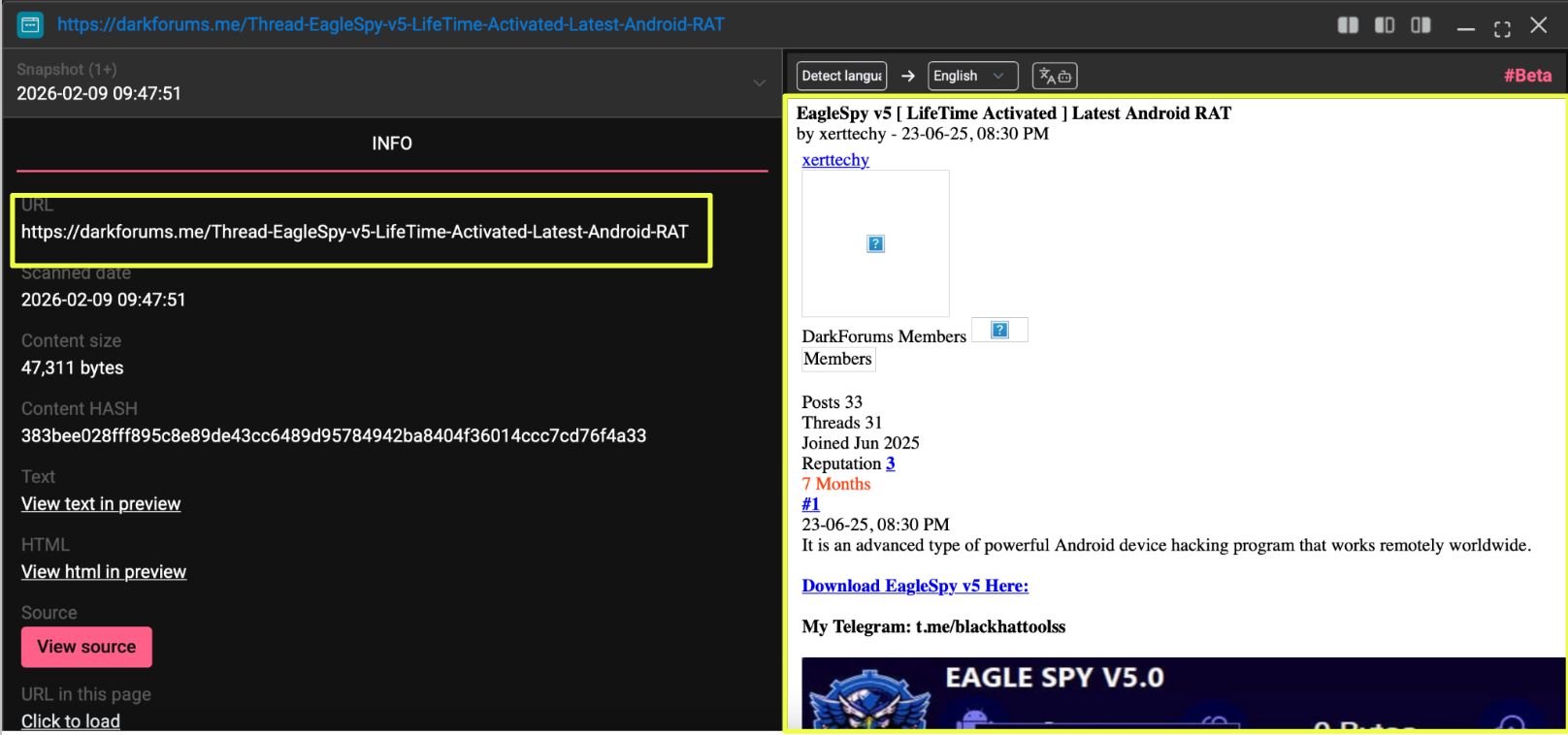 The post promoted “EagleSpy v5” as a lifetime-activated Android RAT, presented as a ready-to-use tool. Its structure and messaging were consistent with many similar listings seen across underground forums: emphasizing ease of use and accessibility rather than technical complexity.