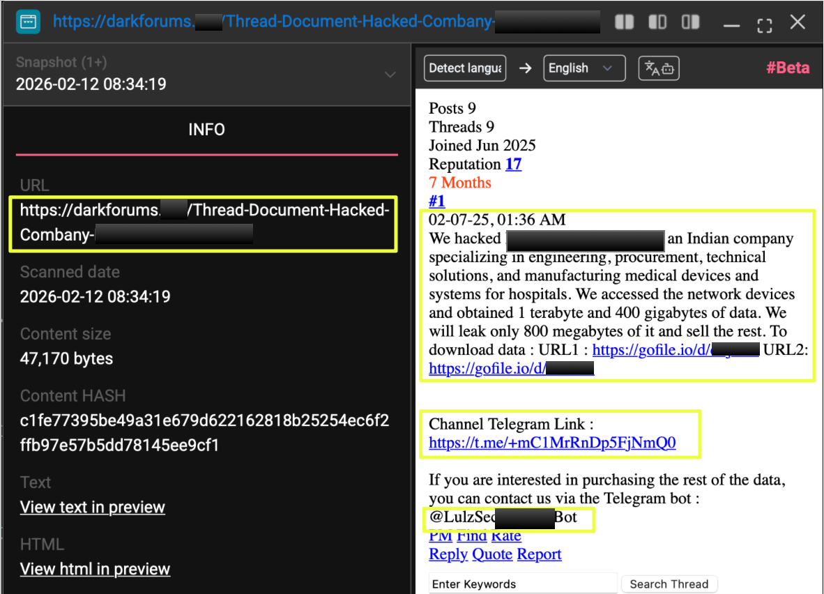 In this post, the actor claimed to have breached M** F****s India, describing the company as an engineering and medical systems manufacturer. The thread included two publicly accessible file-sharing links: