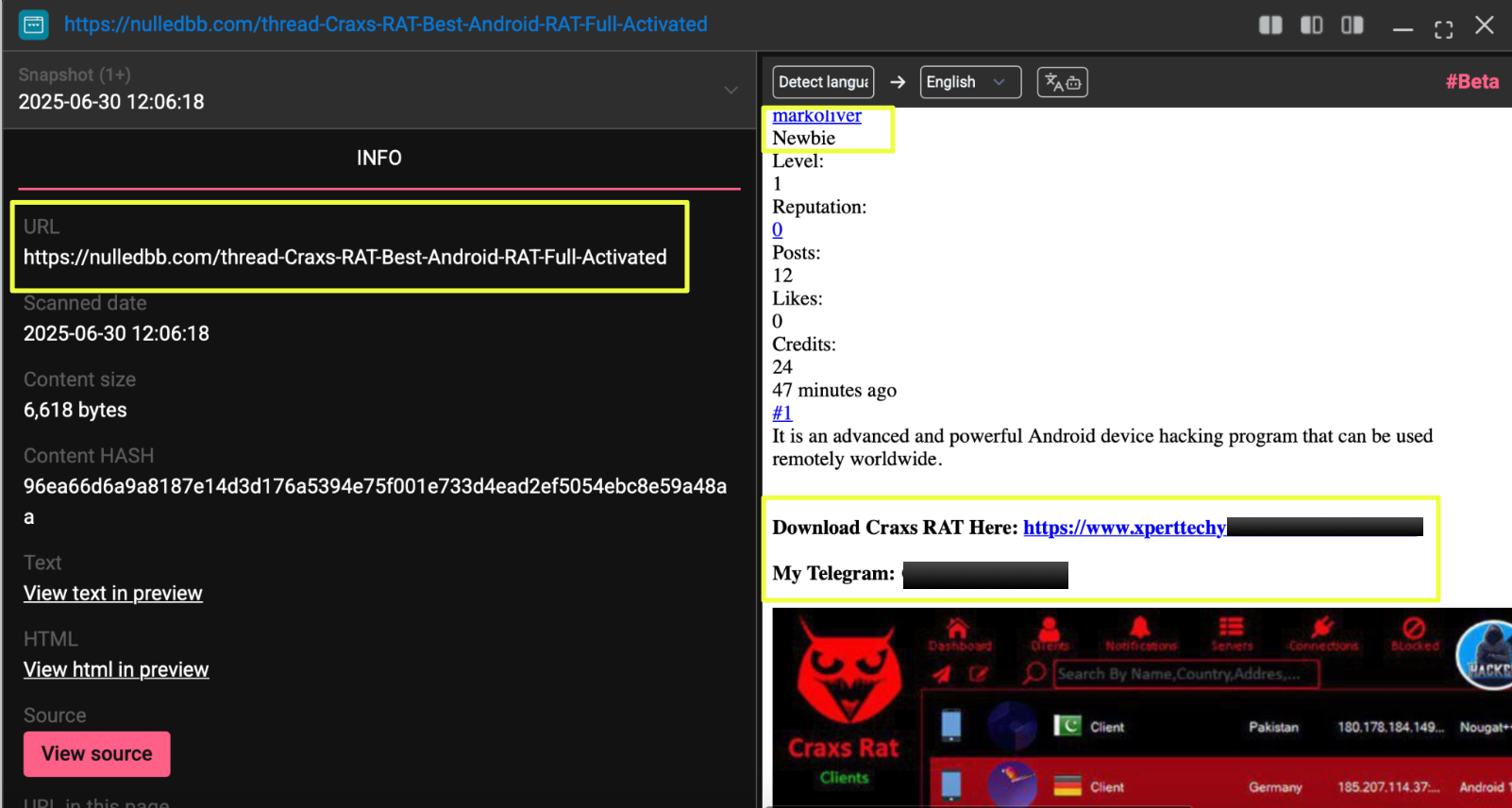 The discovery of the Craxs RAT page marked a shift in the investigation, as activity was no longer confined to forum posts. The website appeared to host similar content, promoting cracked versions of tools that had already been observed on DarkForums.