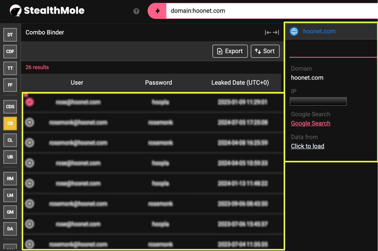 The persistence of hoonet.com credentials long after its documented role as a Chosun Expo front strongly supports the hypothesis of infrastructure recycling. Even if no active hosting remains, its digital footprint continues to appear in modern combo lists and leak aggregations, suggesting reuse by derivative operators or persistence within underground data ecosystems.