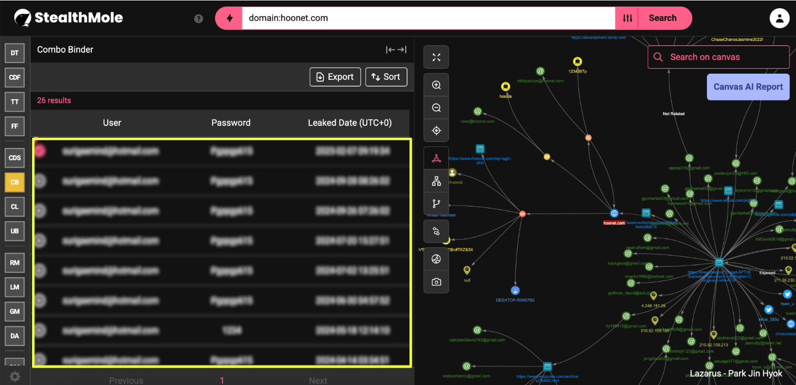 Domain analysis confirmed a recurring link between the Chosun Expo Joint Venture and its associated domain hoonet.com, both previously documented as Lazarus front entities. StealthMole’s Combo Binder results revealed multiple internal @hoonet.com accounts exposed between 2022 and 2025.