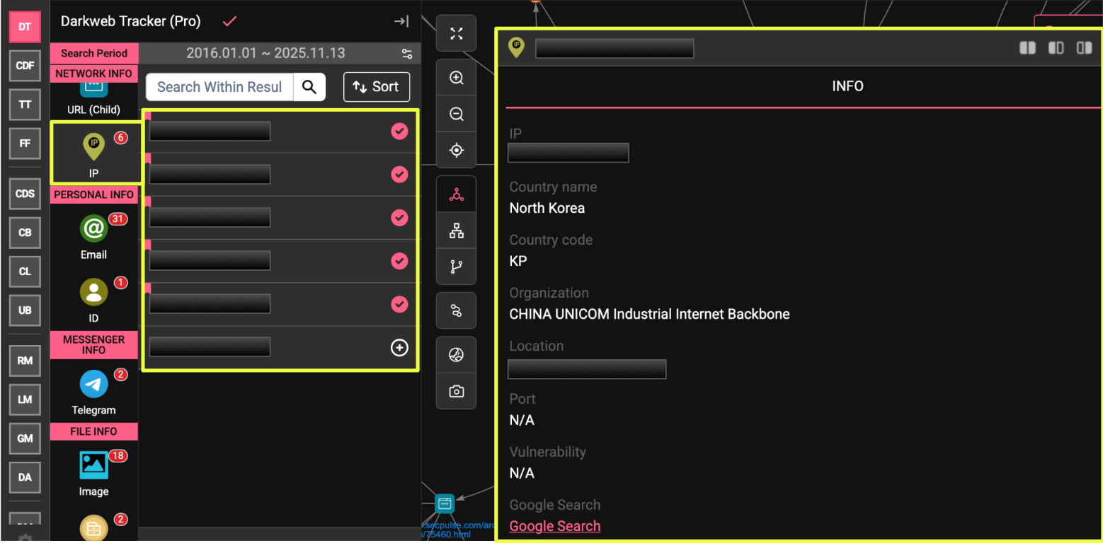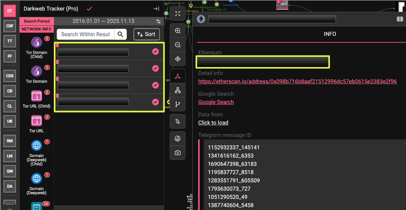With the verified datasets in place, the next phase focused on establishing infrastructure continuity, linking the accounts, domains, and IP ranges to known Lazarus and APT38 operations. Using StealthMole’s integrated tools, each verified indicator was cross-referenced across DNS, WHOIS, and credential datasets to identify overlapping ownership patterns and operational signatures.