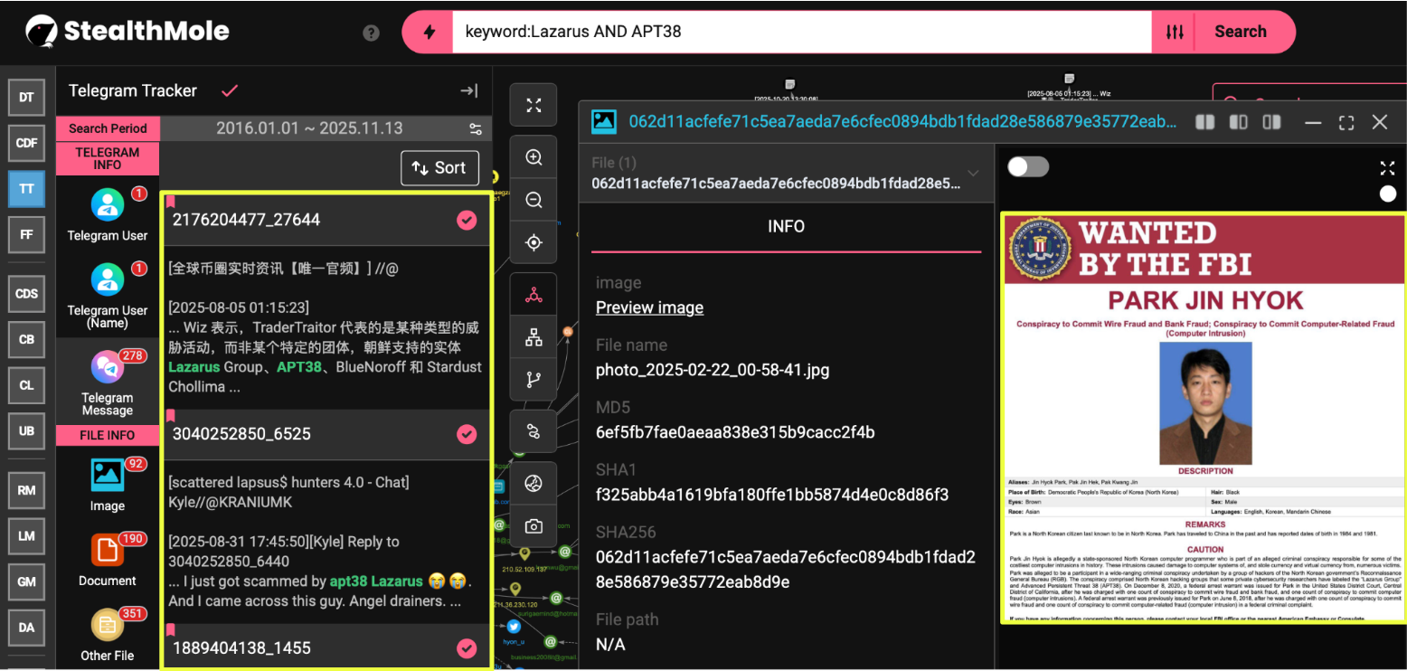 To validate whether these on-chain artifacts could connect to personal identifiers, the investigation pivoted toward off-chain indicators. StealthMole Telegram Tracker was used to surface any mentions of the group, revealing channels discussing Lazarus-linked scams and reposts of the FBI’s wanted bulletin for Park Jin Hyok. These independent mentions established that the operator’s identity remained a live subject of discussion within underground circles, a useful signal for attribution continuity.