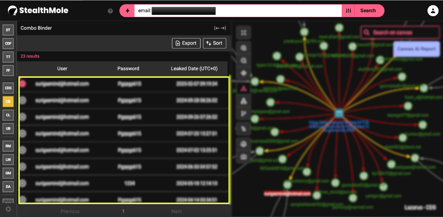 StealthMole’s Combo Binder, Credential Lookout, and Compromised Data Set (CDS) modules revealed recurring exposure patterns across multiple Lazarus-linked email addresses.Each entry was cross-checked for leak source, date range, and password reuse, establishing continuity between historical identifiers and recent breach activity.