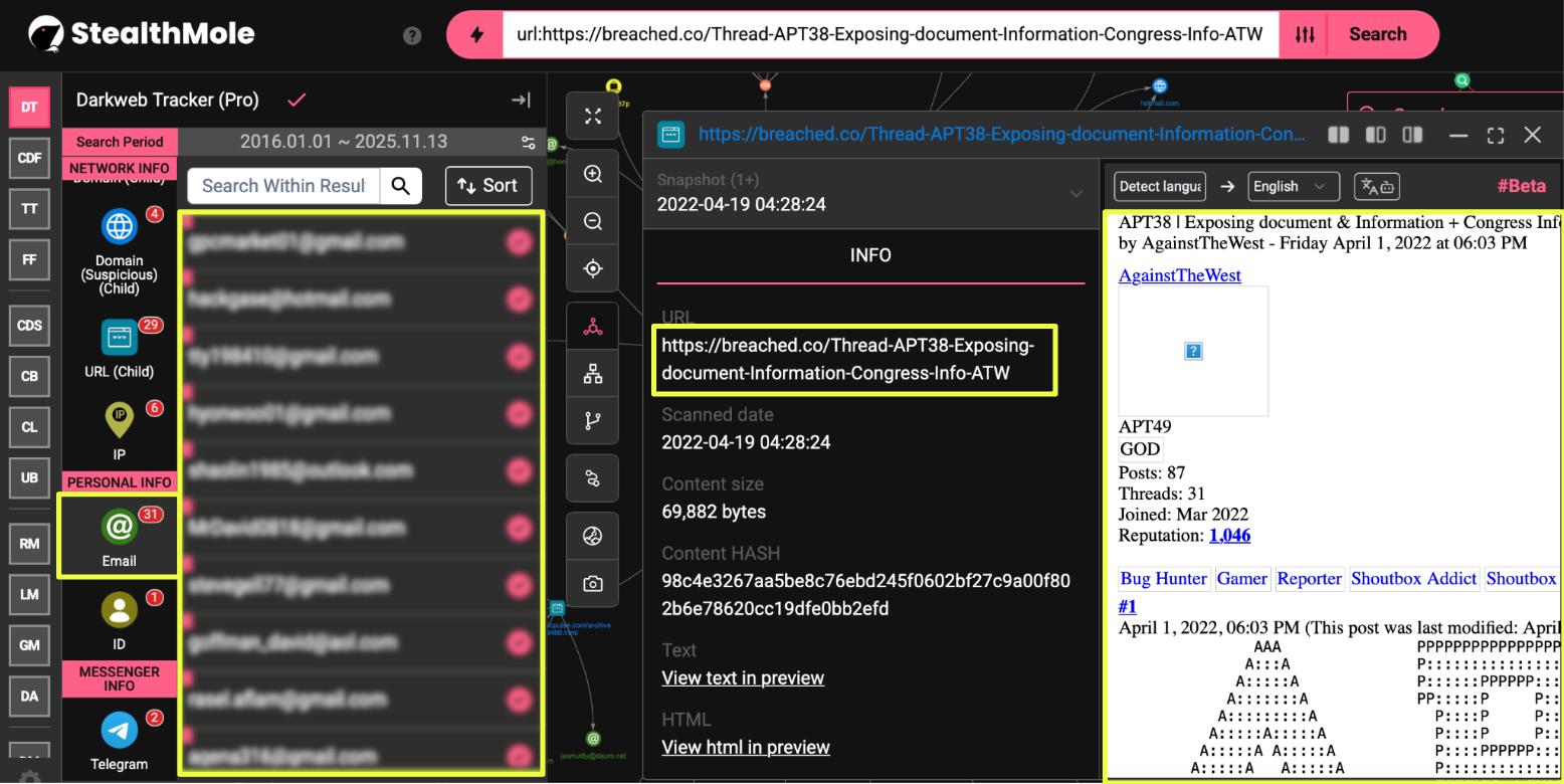 Following the Ethereum wallet correlation, the investigation expanded to examine identifiers historically tied to Park Jin Hyok. The process began with the StealthMole query on the email address bu*********it@gmail.com, which surfaced a 2022 BreachForums thread authored by the user AgainstTheWest (ATW). The post claimed to expose datasets related to APT38 and included a comprehensive list of emails, IP addresses, aliases, and domains allegedly connected to Park and the broader Lazarus network.