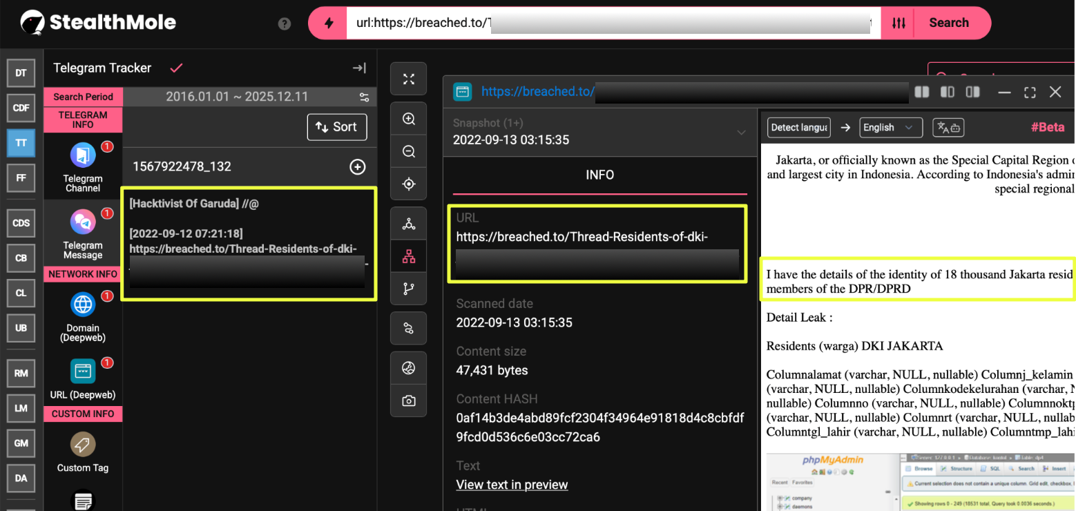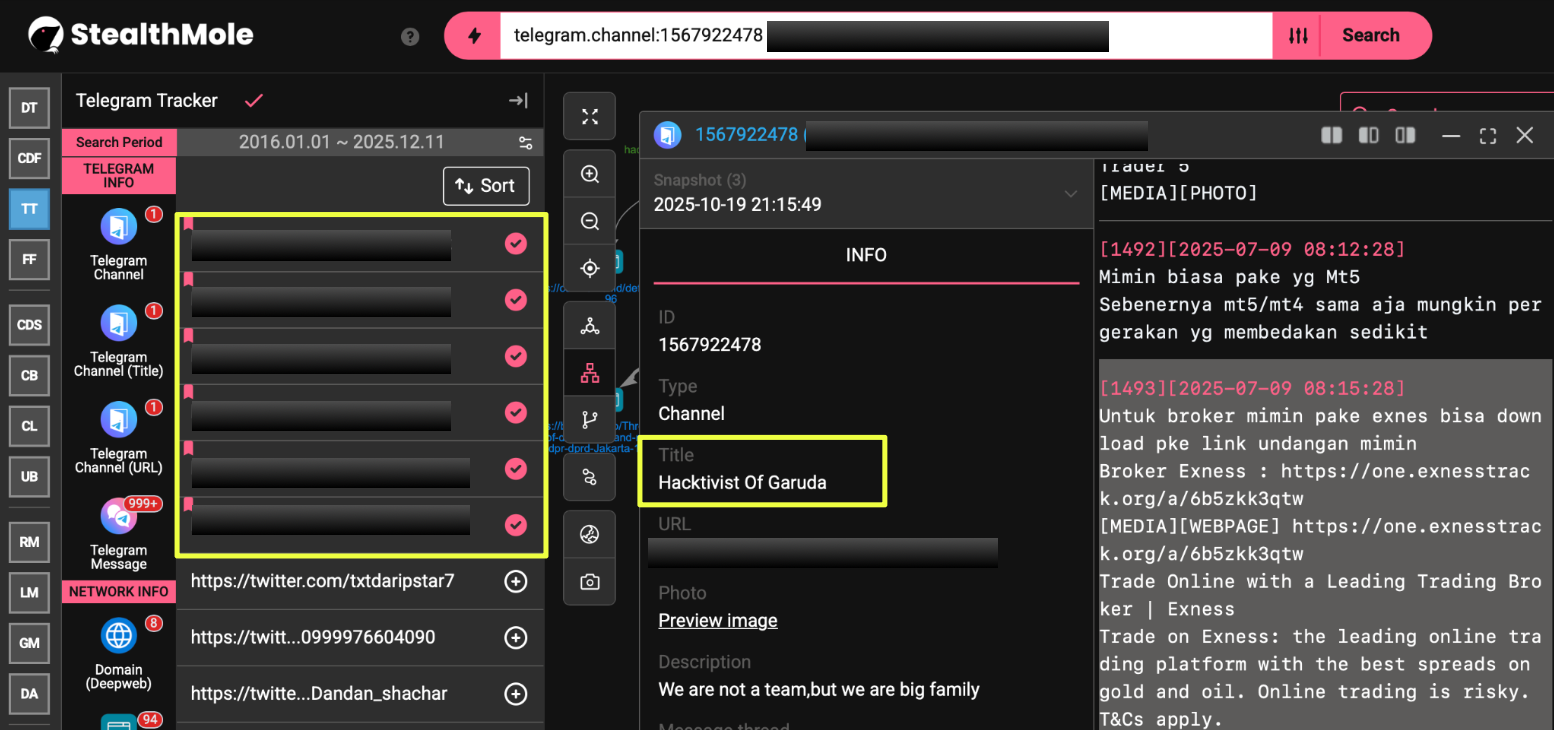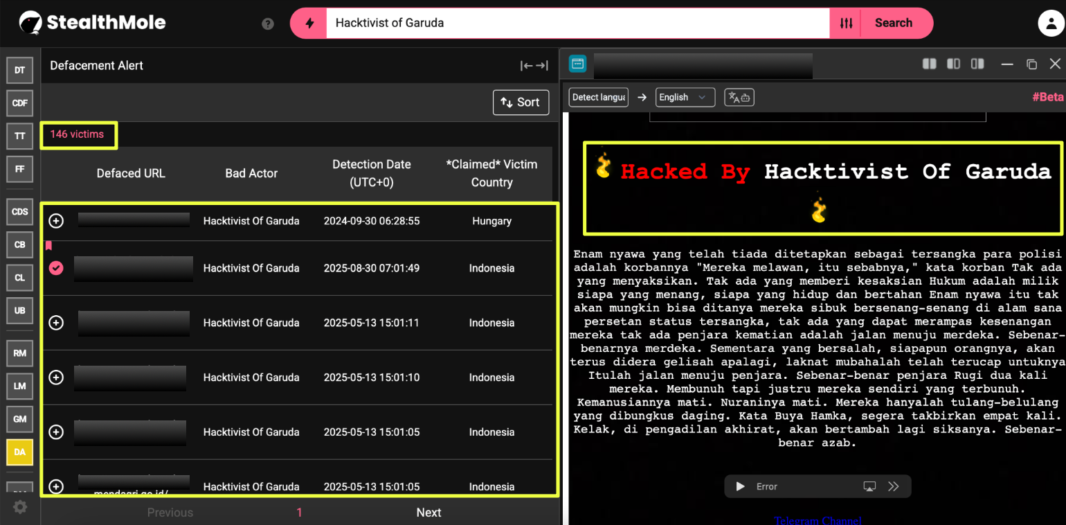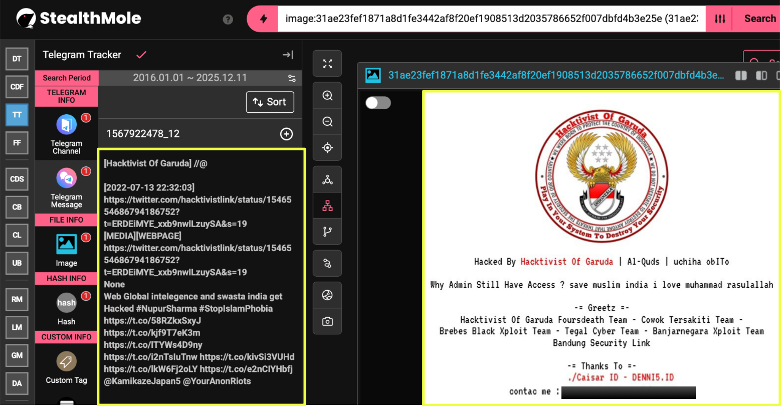 The investigation began with a simple query: “Hacktivist of Garuda” run through StealthMole’s DarkWeb Tracker. At first glance, the results suggested an obscure Indonesian defacement crew with scattered mentions across low-traffic forums. But the deeper we pushed the keyword, the more the picture shifted. What looked like a fringe actor began resurfacing across Telegram archives, suspended Twitter accounts, forgotten Zone-H mirrors, and traces of data leaks posted under half-finished aliases.