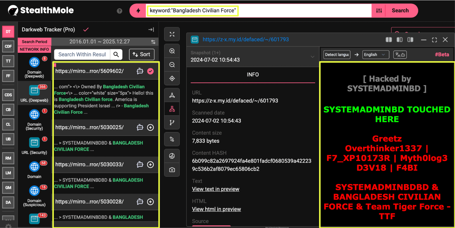 To validate this assumption, I began with a keyword search for Bangladesh Civilian Force using StealthMole’s dark web and telegram tracking capabilities. Early results immediately pointed toward defacement activity explicitly attributed to BCF. Several defaced websites carried clear attribution banners naming the group, indicating that BCF was not merely an online commentator but an actor claiming direct involvement in cyber activity.