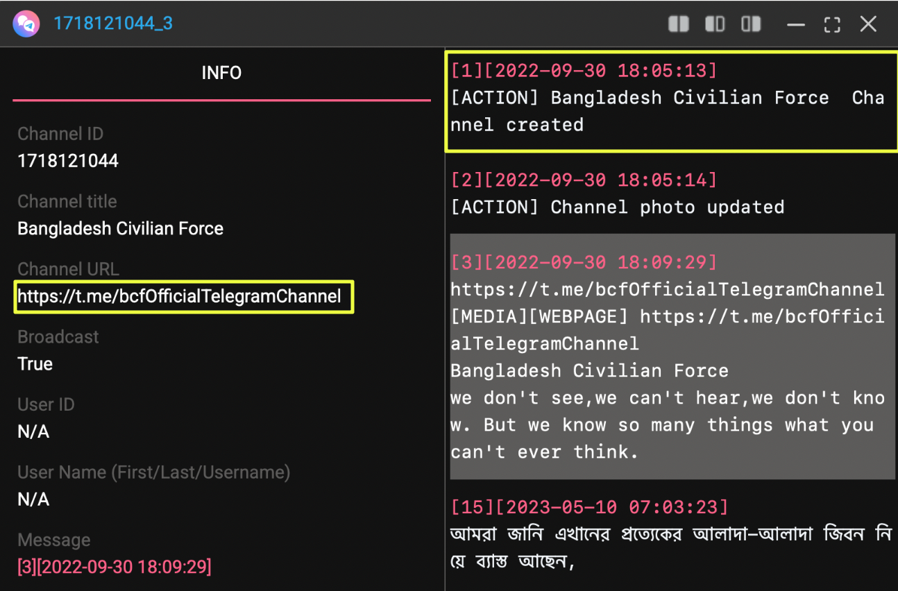 Further analysis uncovered additional Telegram channels tied to the same name, including https://t.me/bcfOfficialTelegramChannel, which is currently inaccessible but available through StealthMole’s historical indexing. This channel was created on 30 September 2022, adding another layer to the timeline.