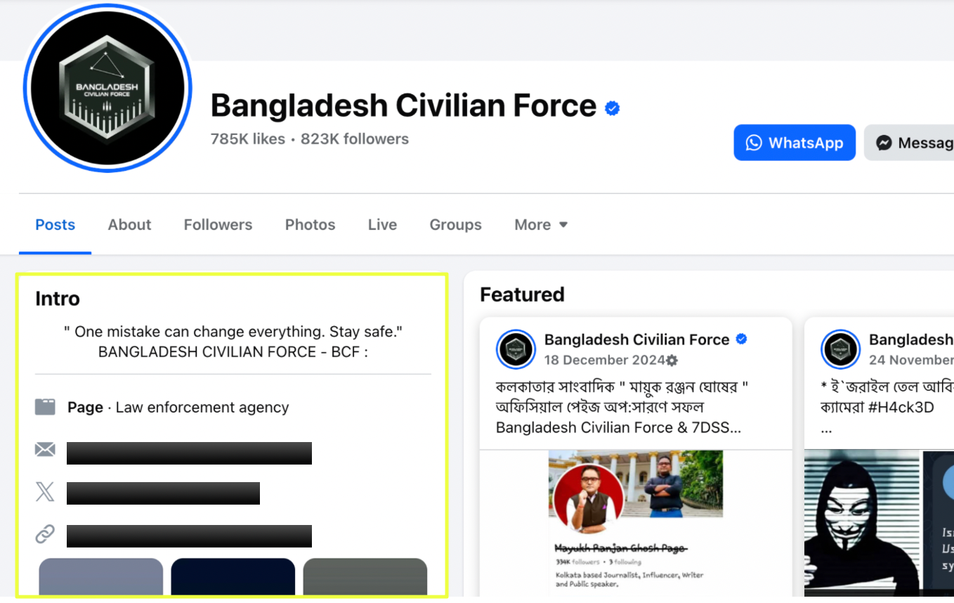 The most prominent BCF presence appears on Facebook, where a verified page titled Bangladesh Civilian Force commands a following exceeding 800,000 users. The page categorizes itself as a law enforcement agency and lists a founding date of April 2019. Within the scope of this investigation, no independent verification of this status was identified.