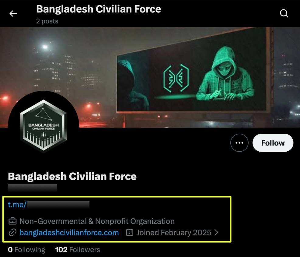 BCF’s presence on Twitter/X further reinforced cross-platform continuity. The account https://twitter.com/C********9 remains active and uses the same hexagon logo seen on Telegram and Instagram. The profile references bangladeshcivilianforce.com, strengthening the link between social media activity and the group’s claimed web presence.