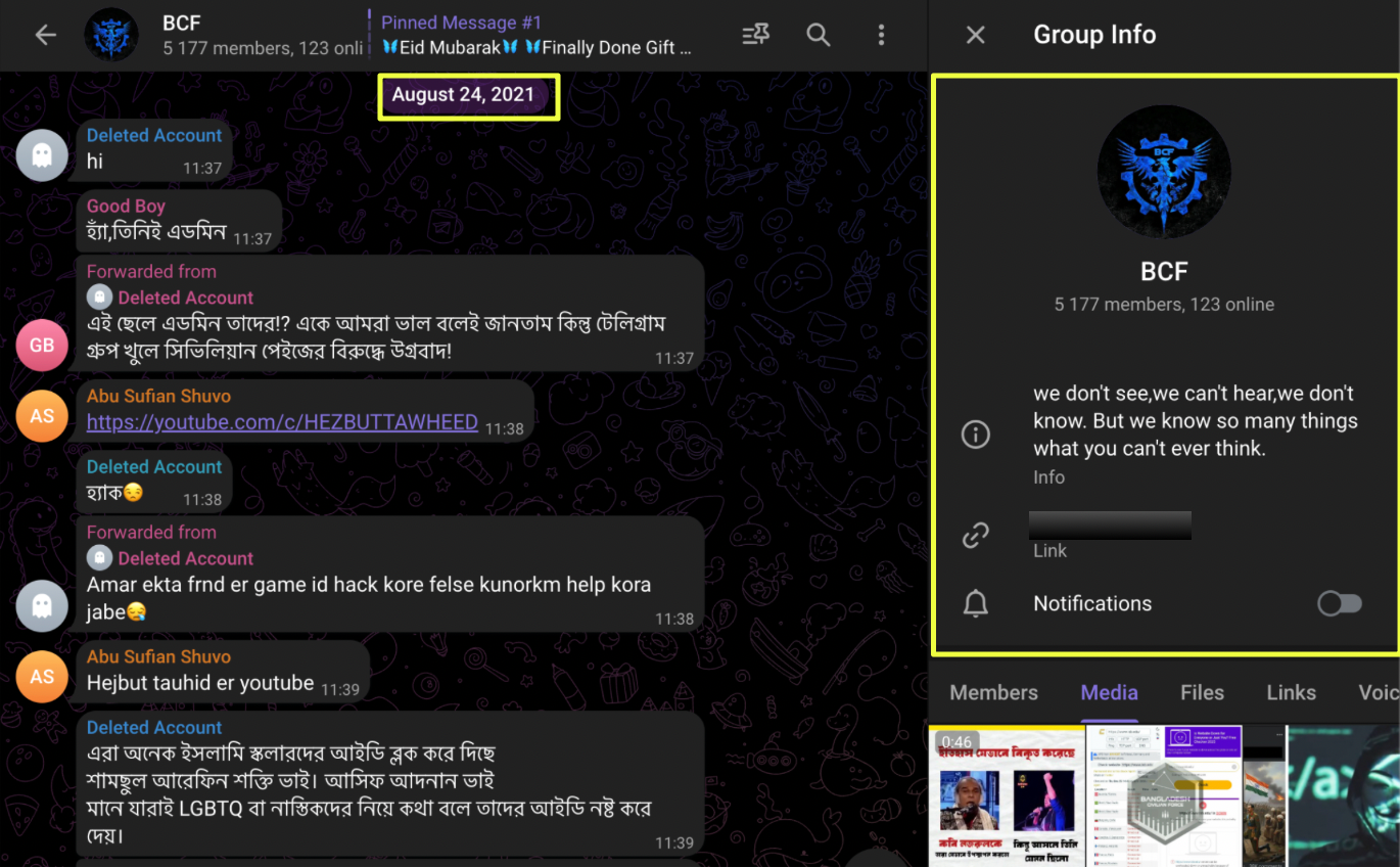 Historical message review showed that the channel’s earliest visible activity dated back to August 2021. During this early phase, the space functioned as a discussion group rather than a broadcast outlet. Members exchanged text messages and voice notes, suggesting an informal community environment rather than a tightly controlled operation.