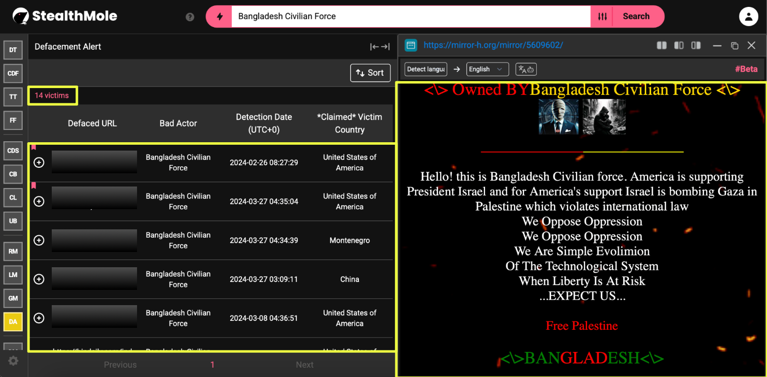 Running the same keyword through StealthMole’s Defacement Alert tool surfaced 14 distinct victims associated with BCF activity between May 2023 and February 2024. This figure reflects only what was captured within StealthMole’s indexed monitoring window and should not be interpreted as a complete count of the group’s operations. Even within this limited dataset, recurring ideological slogans and consistent attribution language suggested an organized effort rather than isolated acts.