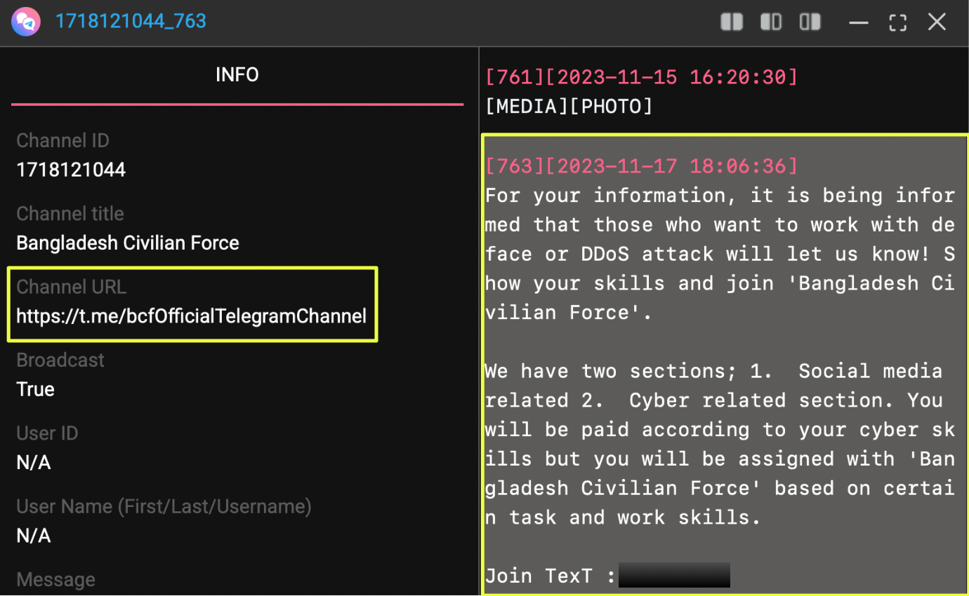 To understand how BCF coordinated its activity, I pivoted to Telegram using StealthMole’s Telegram Tracker. A keyword search led to a channel titled BCF, accessed through the invite link https://t.me/+75*******Vl. Channel metadata revealed that this invite link redirected to https://t.me/bc******l, indicating a username change rather than a separate entity.