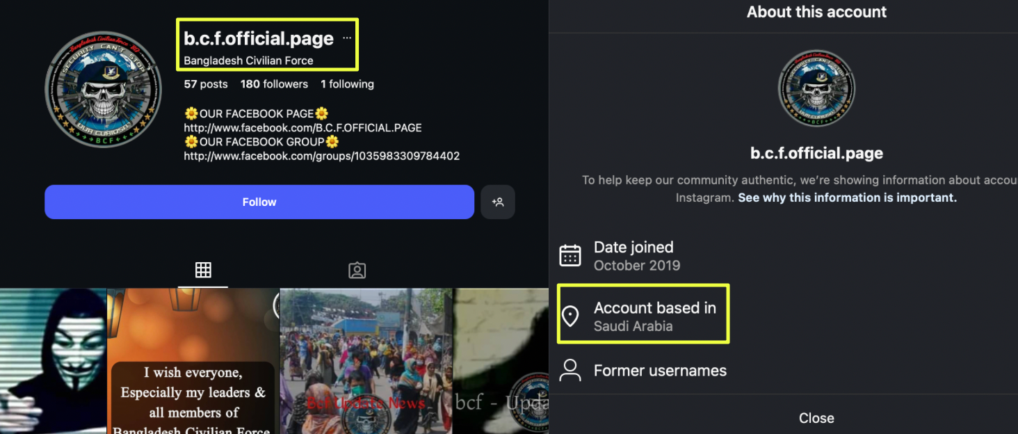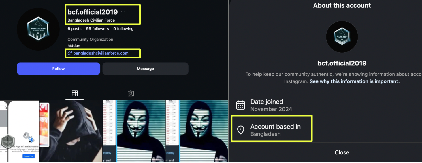 Telegram analysis led to the discovery of multiple Instagram accounts associated with BCF. One account, https://www.instagram.com/bcf.official2019, was created in 2024 and showed limited activity. It used a hexagon-shaped logo and referenced the group’s website, bangladeshcivilianforce.com, mirroring branding seen on other platforms.