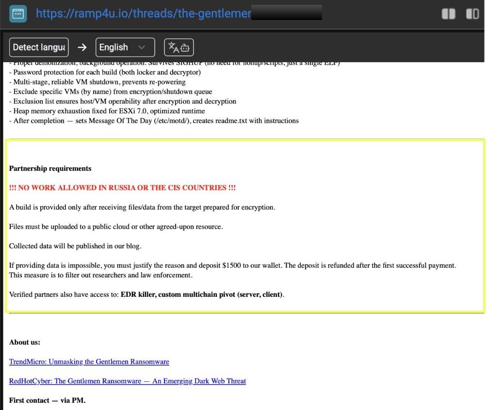 The recruitment thread also outlines a geographical restriction: affiliates are prohibited from conducting operations in Russia or the CIS region. This is a common rule in cybercriminal communities but is presented by THE GENTLEMEN as an explicit operational boundary. The presence of such restrictions, combined with their screening deposit, reflects a structured attempt to control the behavior of affiliates and minimize unwanted exposure.
