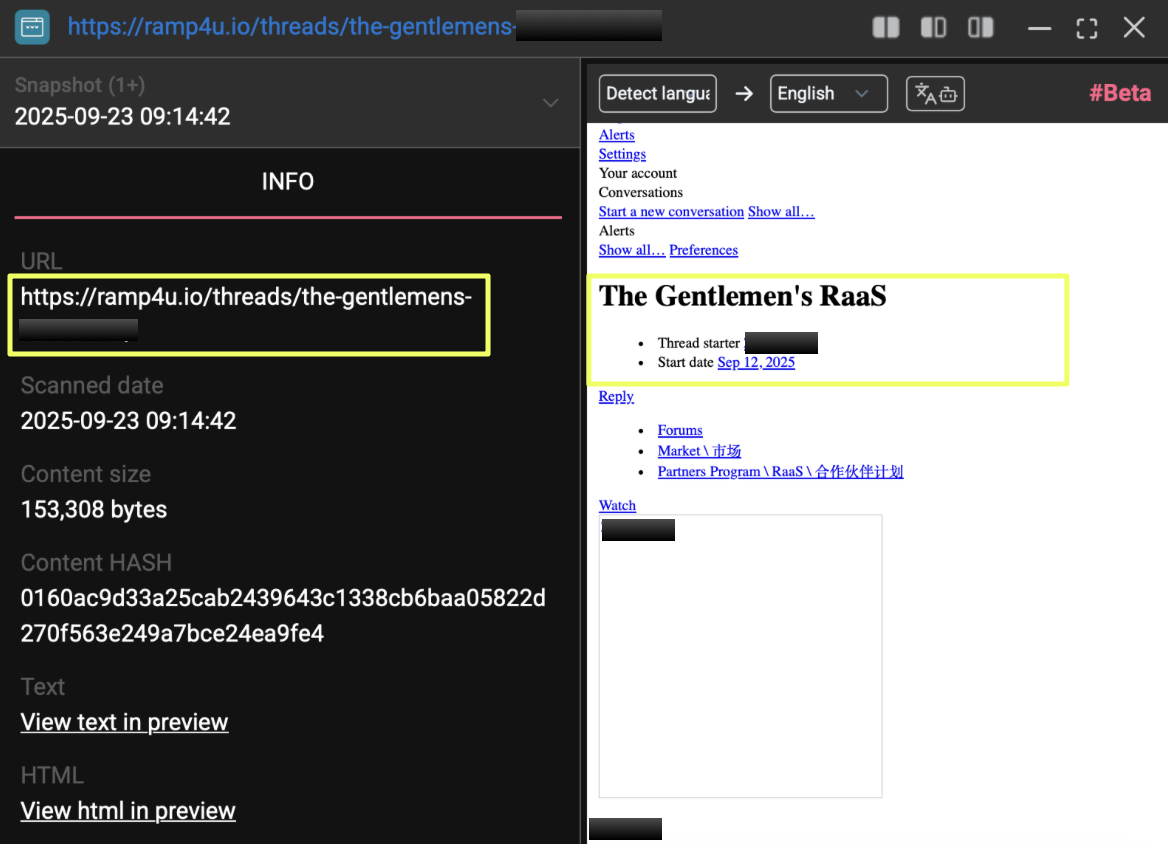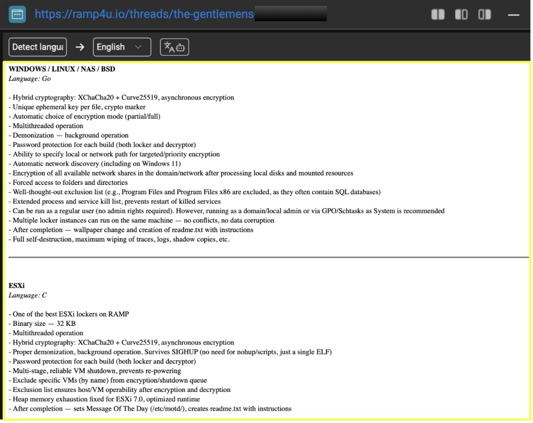 THE GENTLEMEN articulate their service model openly through a recruitment thread posted on the RAMP cybercrime forum by a user operating under the handle “Z*****8”. The post, created on 12 September 2025, is presented in English, Russian, and Chinese, indicating an intent to attract a broad pool of affiliates rather than limiting themselves to a specific regional audience. The multi-language format also suggests that the group anticipates participation from operators with varying levels of technical maturity, and therefore seeks to make their offering accessible from the outset.