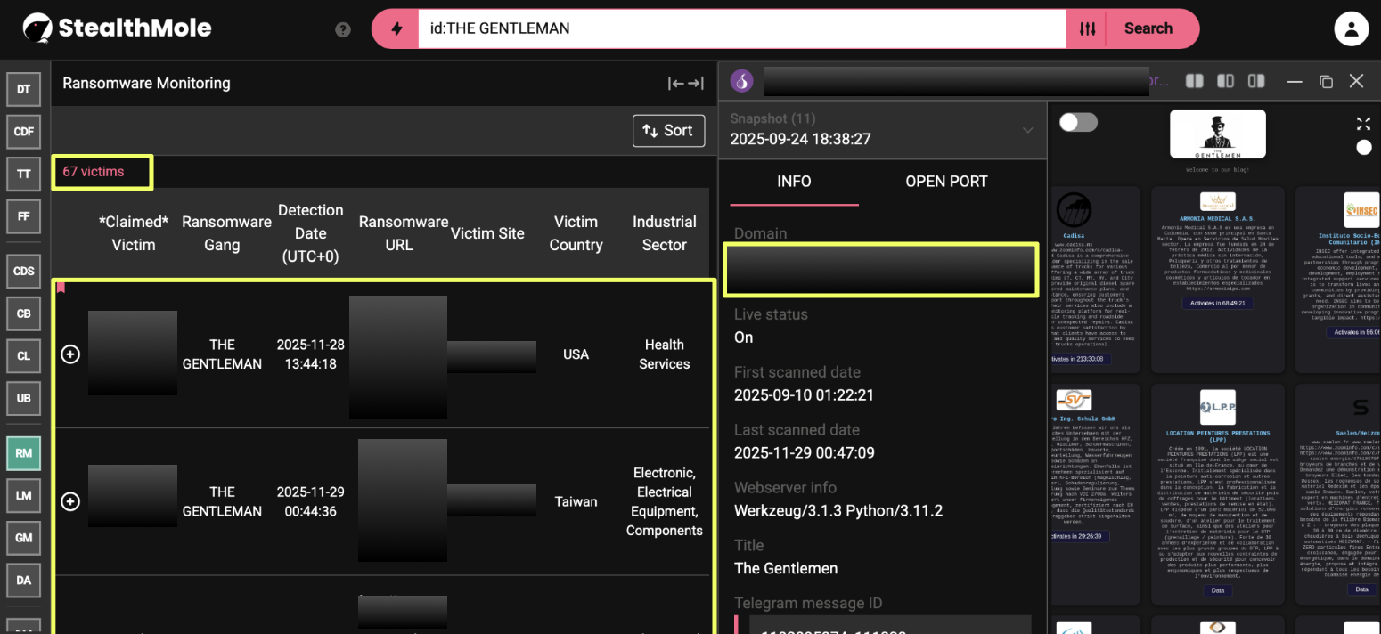 This incident is part of a wider surge attributed to THE GENTLEMEN throughout mid-2025 onward, during which StealthMole has recorded 67 confirmed attacks across diverse sectors including healthcare, manufacturing, education, construction, and insurance. The consistent cadence of new victims suggested a structured operation rather than sporadic targeted breaches.