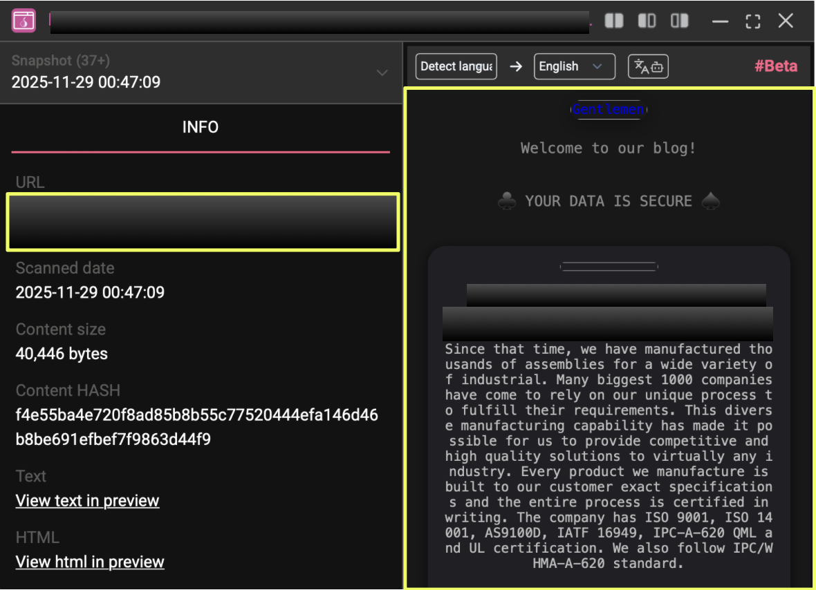 The late-November case provided a natural starting point for deeper analysis. Using the newly indexed entry as the pivot, the investigation expanded to examine how the group maintains its leak-site presence, organizes its victim disclosures, and signals ongoing activity. This incident served as the most recent indicator of their operational tempo and opened the path for mapping the broader ecosystem that supports THE GENTLEMEN’s ransomware service.