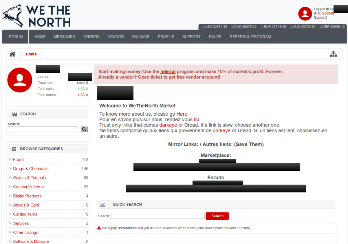 This approach differs from many darknet marketplaces that restrict full functionality to Tor while using surface domains only as reference points. In WeTheNorth’s case, the boundary between surface and dark web presence appeared intentionally thin, with the same branding and structure replicated across all officially listed domains.
