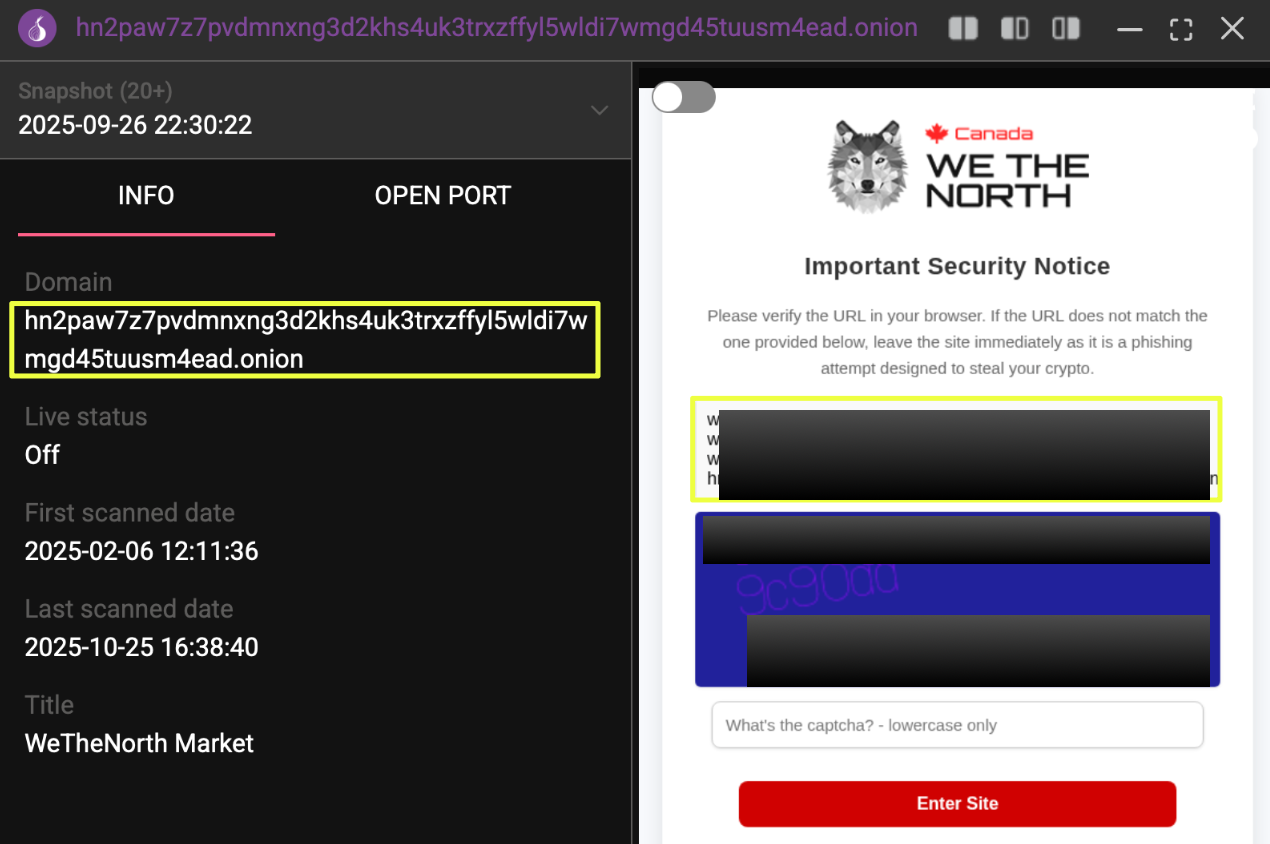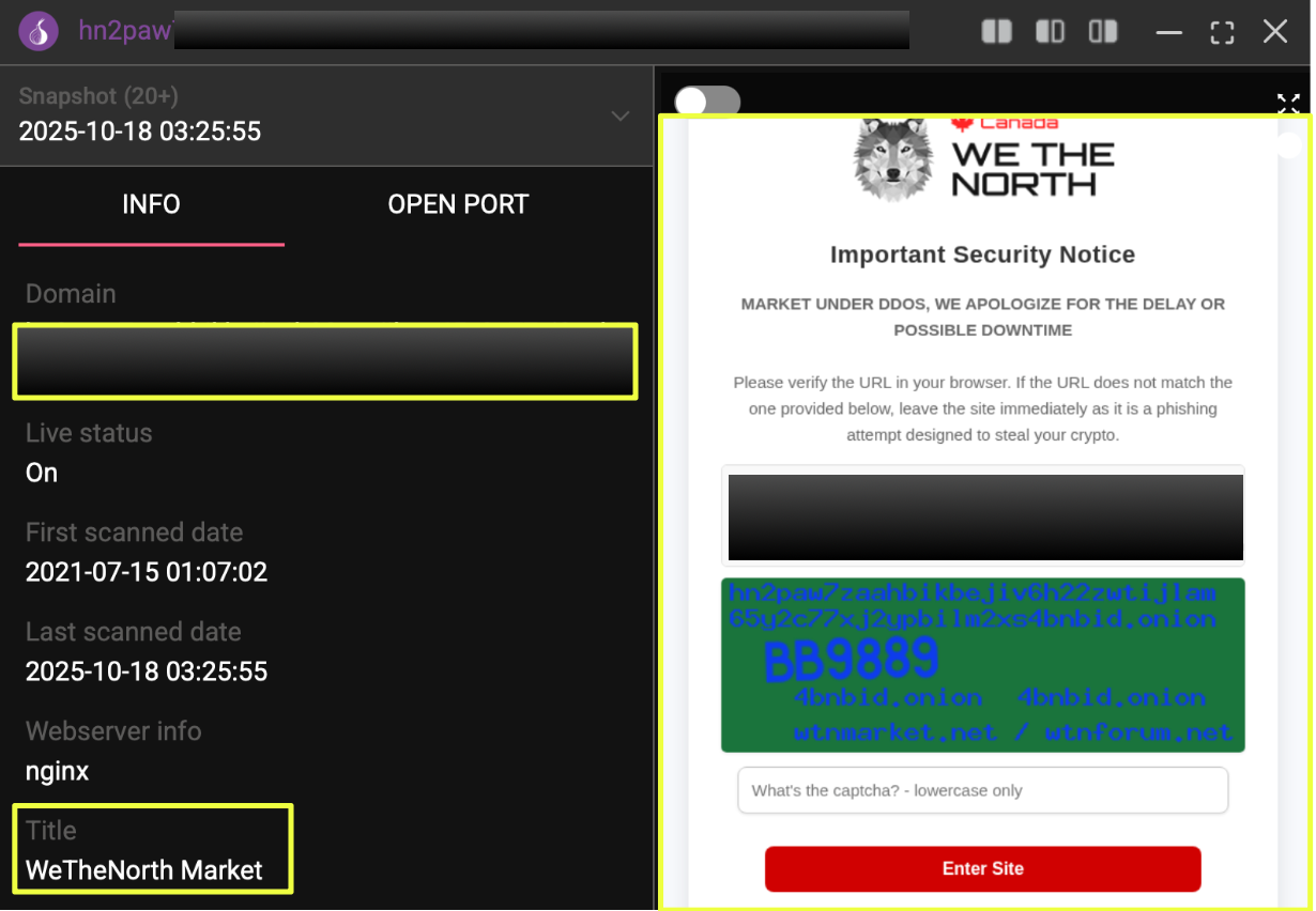 The next step in the investigation was to understand how WeTheNorth presents itself beyond its primary marketplace interface. Rather than limiting its presence to a single Tor address, the platform maintains multiple publicly accessible domains that mirror the same content and structure.