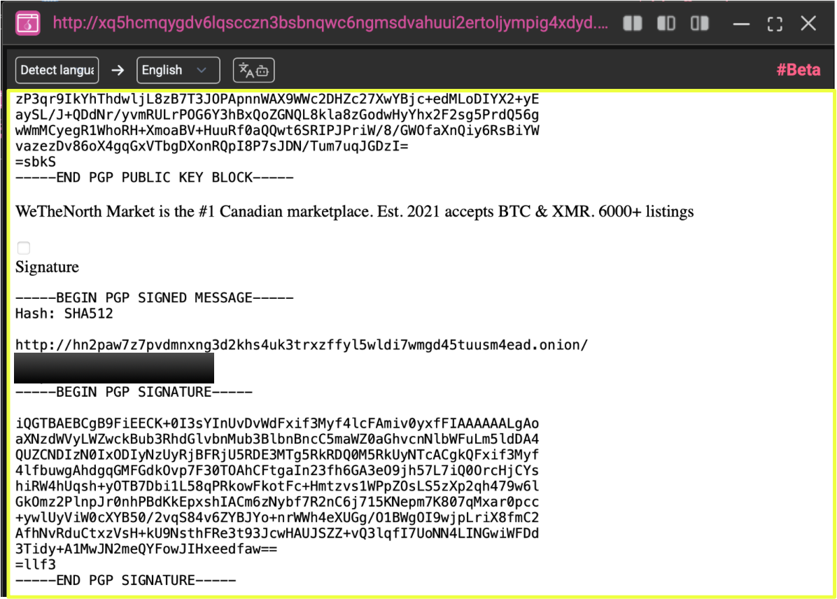 This domain followed the same pattern. It replicated the marketplace interface and included a posted PGP key, further reinforcing the appearance of legitimacy. However, like the earlier discoveries, it was not included in the platform’s published access list.