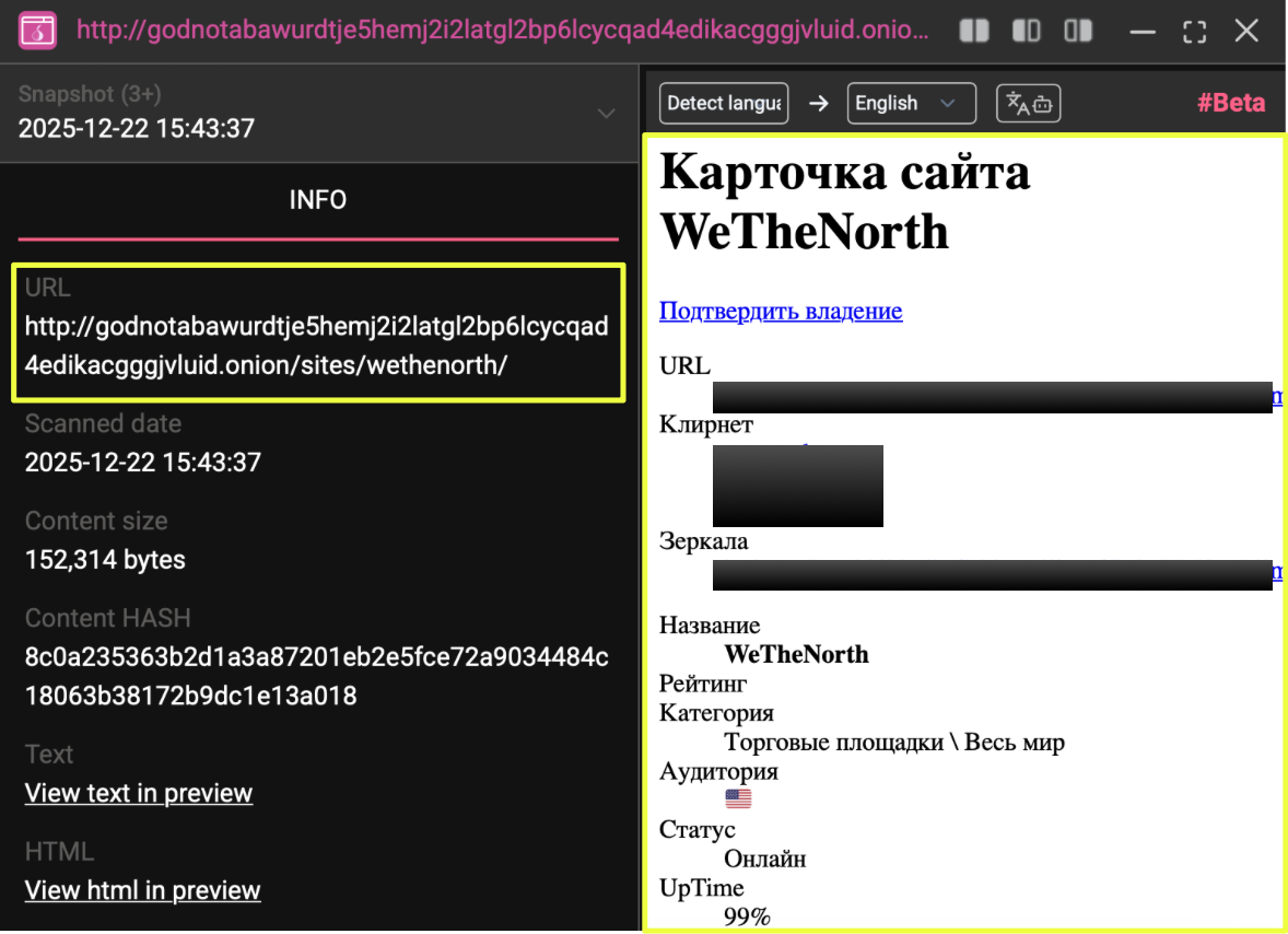 In parallel, a Russian-language dark web site hosting marketplace indexes and discussion threads also contained a dedicated page for WeTheNorth. This page listed access links, summarized platform features, and included user comments discussing availability and performance. The structure and presentation were consistent with a directory or review-style resource rather than an operator-controlled forum.