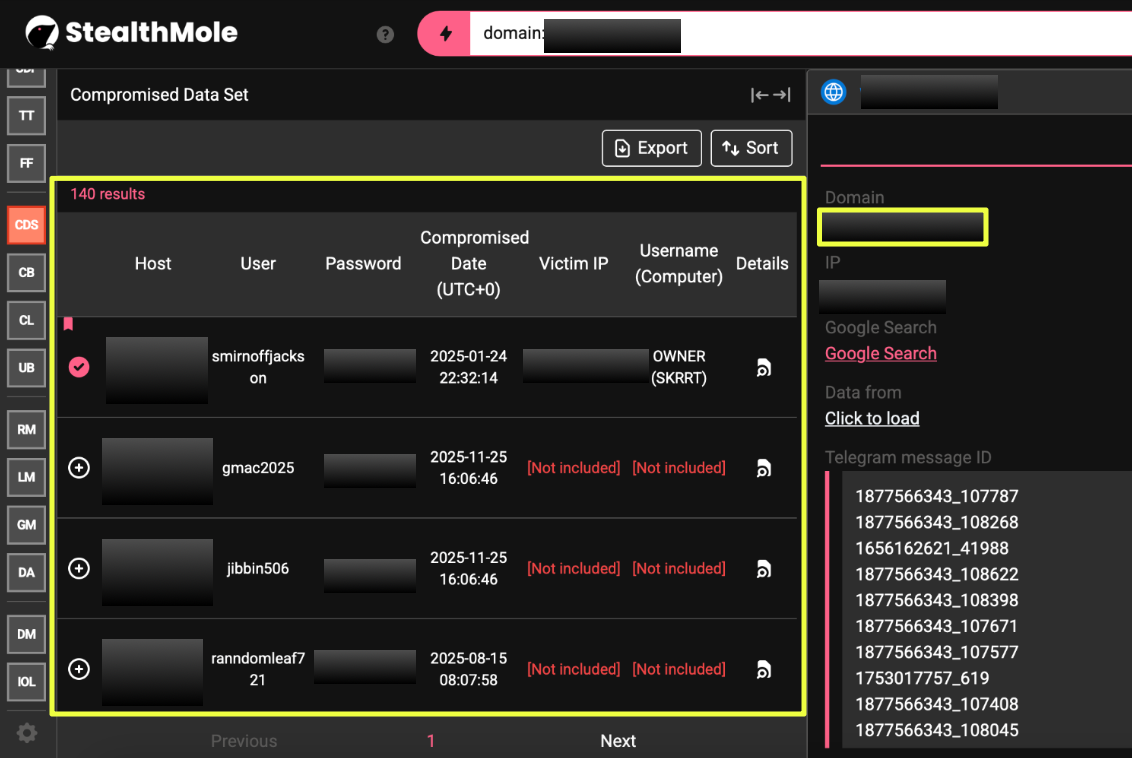 Using StealthMole’s Compromised Data Set (CDS), the surface domain w*******t.net was examined for evidence of leaked user credentials. This query returned 140 distinct credential records associated with the domain. The entries reflected typical stealer-log characteristics, including combinations of usernames, plaintext passwords, and victim-side metadata, rather than structured database exports.