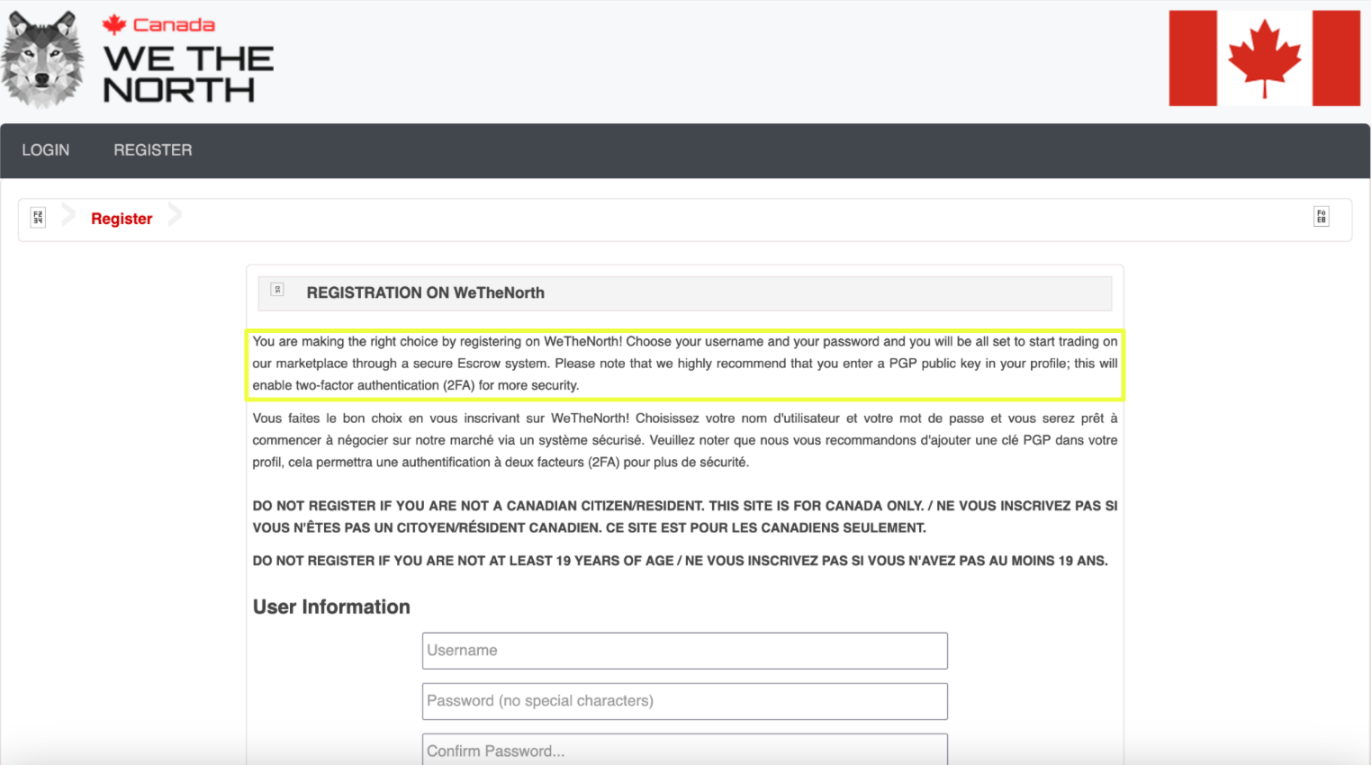 These addresses presented pages that were visually indistinguishable from the officially listed WeTheNorth domains. The layout, language, security notices, and access controls matched what was observed on the endorsed surface and dark web sites. Registration pages were present, and the same Canada-focused framing and operational messaging appeared intact.