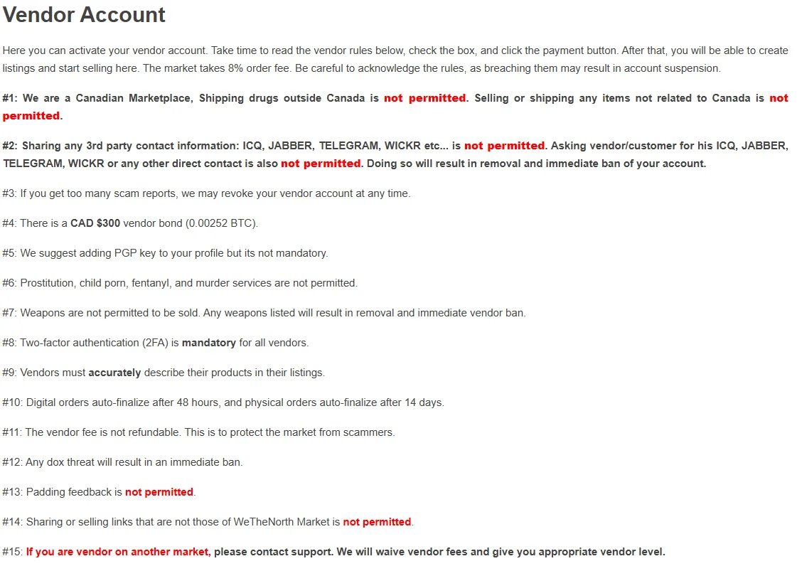 Vendor participation is gated through a formal onboarding process. Sellers are required to activate vendor accounts by posting a bond, intended to deter low-effort scams and disposable identities. Once approved, vendors are subject to a detailed rule set governing listing accuracy, prohibited items, and communication practices. Enforcement is framed as strict and immediate, with repeated references to account suspension or permanent bans for violations.