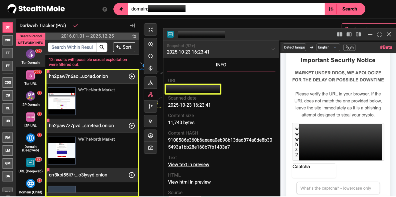 The conclusions presented here reflect a snapshot of WeTheNorth-linked activity based solely on verifiable domains, timestamps, and artefacts surfaced through StealthMole’s tracking capabilities. The aim is not to capture every possible branch of this ecosystem, but to demonstrate how structured, evidence-based analysis can reveal meaningful patterns within environments that are, by design, unstable and continuously evolving.