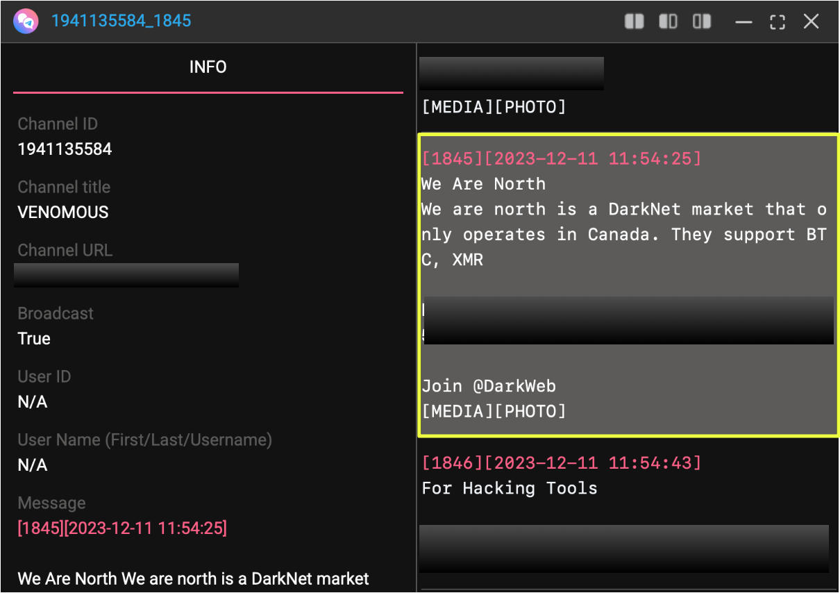 One Telegram channel, VENOMOUS, included a post describing the platform as Canada-focused and claimed that it supported Bitcoin and Monero payments. Notably, these claims were not accompanied by wallet addresses or deposit instructions, and no such payment details were publicly visible on the marketplace pages observed during this investigation. As such, the payment references are best understood as third-party descriptions rather than verified platform disclosures.