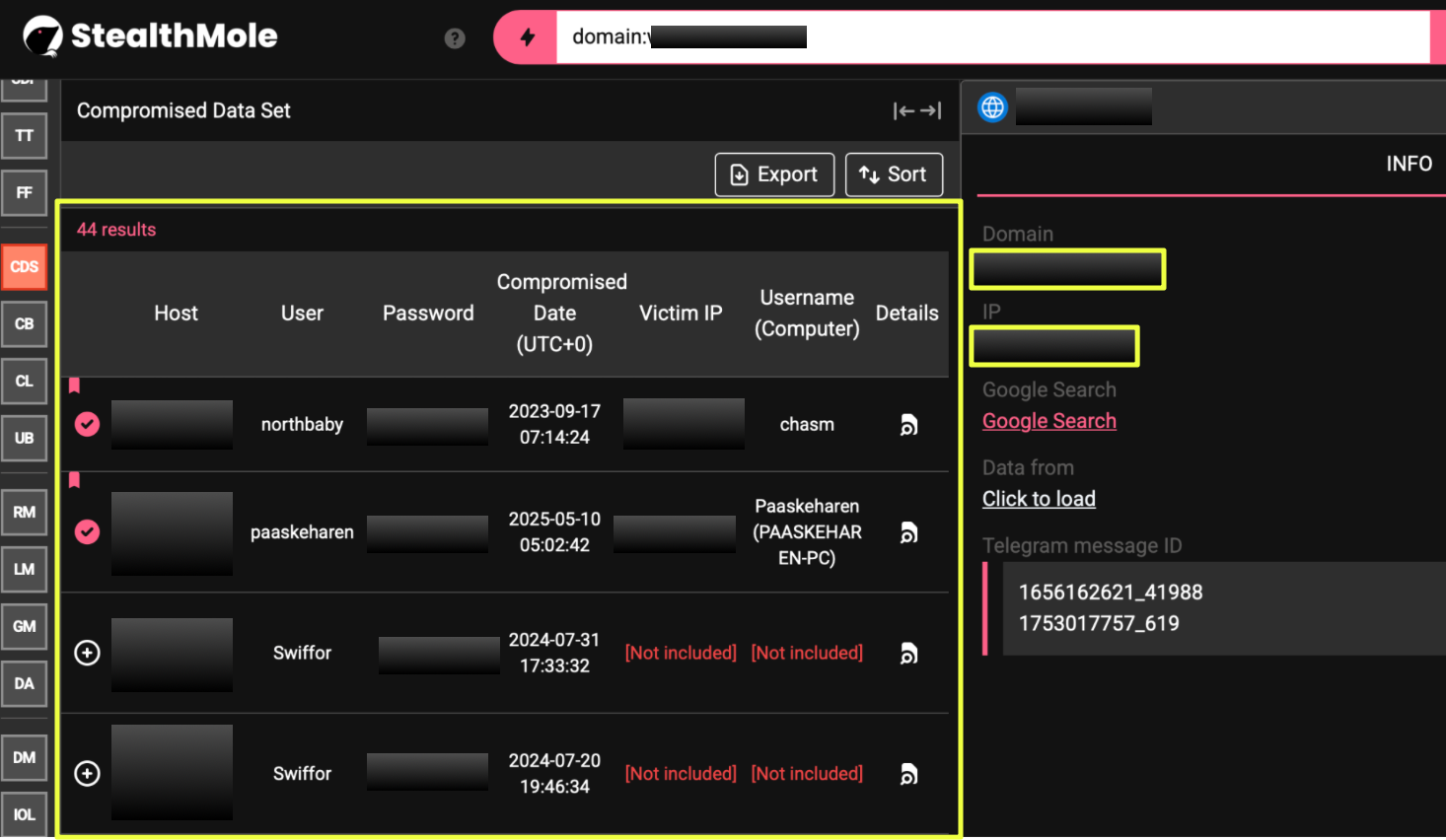 A similar pattern emerged when the forum domain w*******m.net was examined. Running this domain through CDS returned 44 credential records, again consistent with user-side compromise rather than platform-level intrusion. The distribution of victim IPs and timestamps suggested infections occurring across different environments, rather than a centralized breach event.