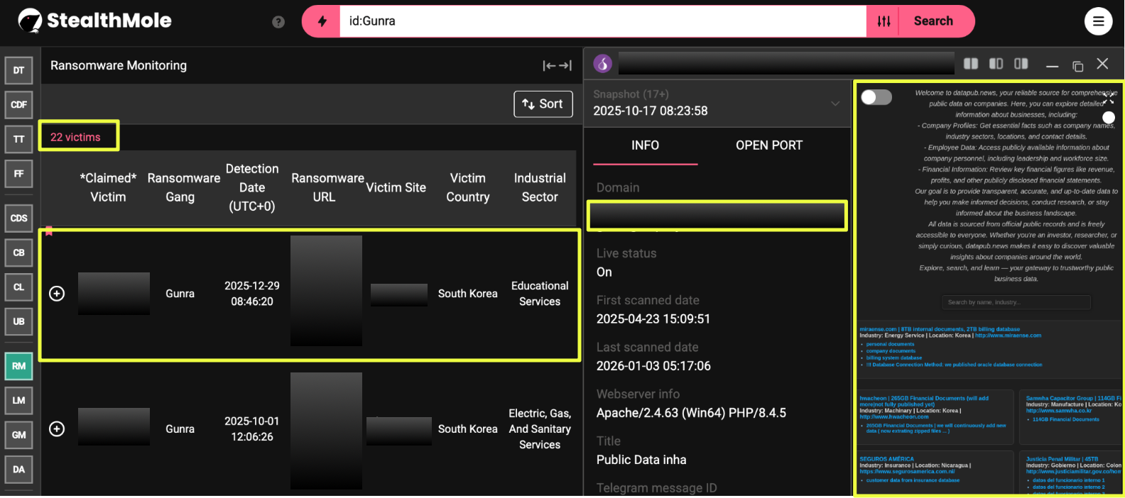 This report documents Gunra’s activity through a focused investigation initiated by a ransomware leak targeting a South Korean university. Using StealthMole’s ransomware monitoring and dark web tracking capabilities, the objective of this case is to reconstruct Gunra’s operational footprint, map its infrastructure, and assess how ransomware execution, data exposure, and communication channels intersect within a single threat actor ecosystem.