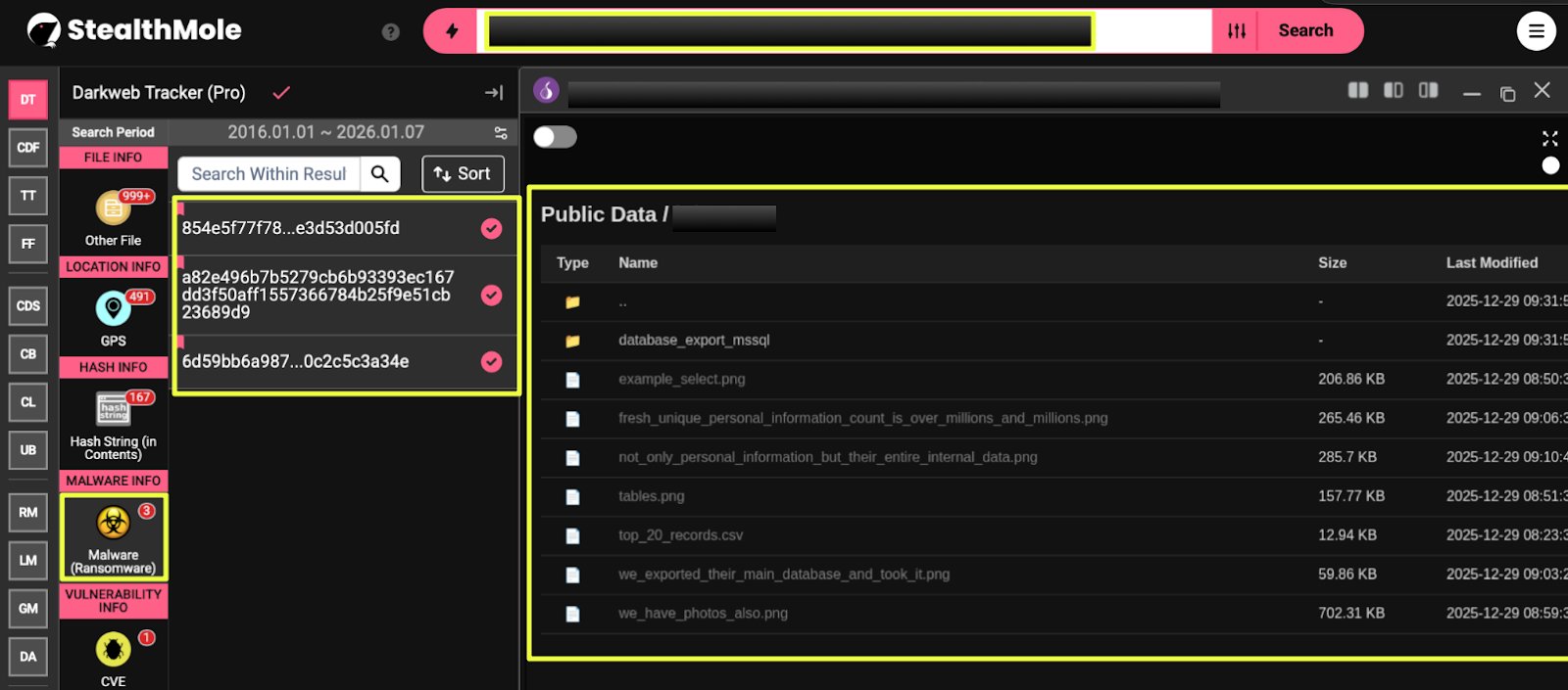 Using StealthMole’s dark web tracker, the investigation next pivoted from Gunra’s leak infrastructure toward executable artifacts associated with the operation. This process identified three distinct malware hashes that were directly linked to Gunra-controlled environments: