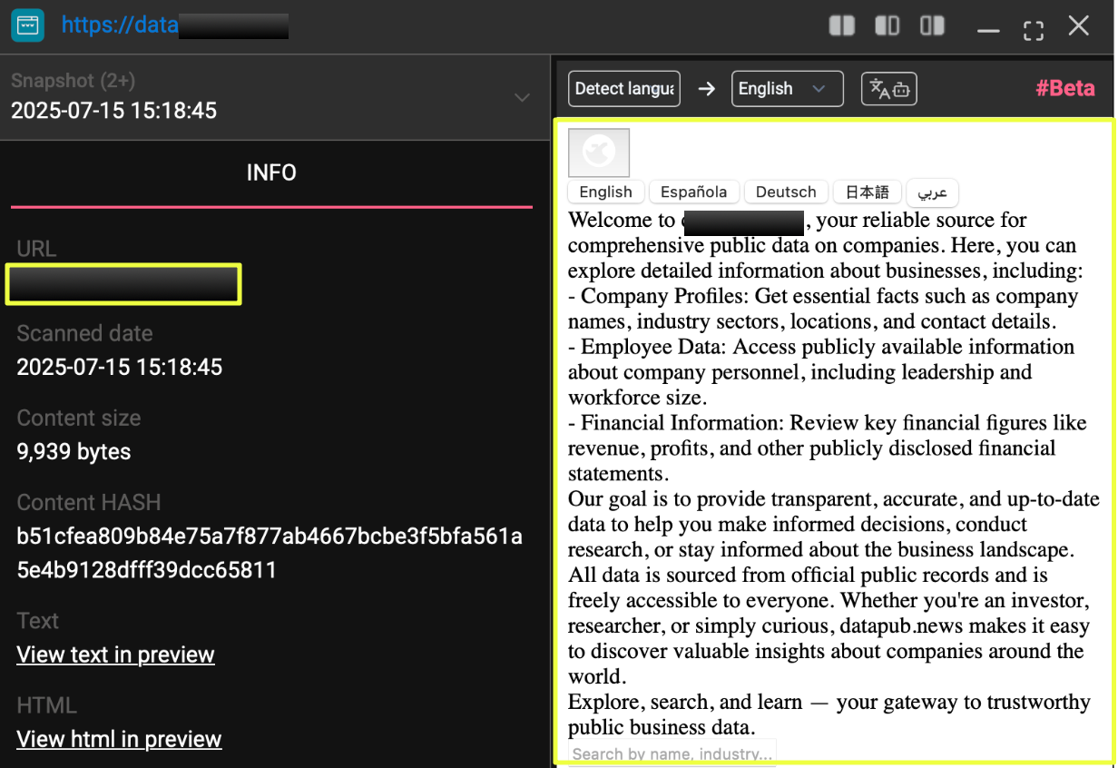 The site at https://d*****.*****s presents itself as a public business information platform, claiming to aggregate data from official public records. However, further investigation revealed that this domain was linked to additional Tor sites displaying the same language, layout, and victim references observed on Gunra’s leak infrastructure.