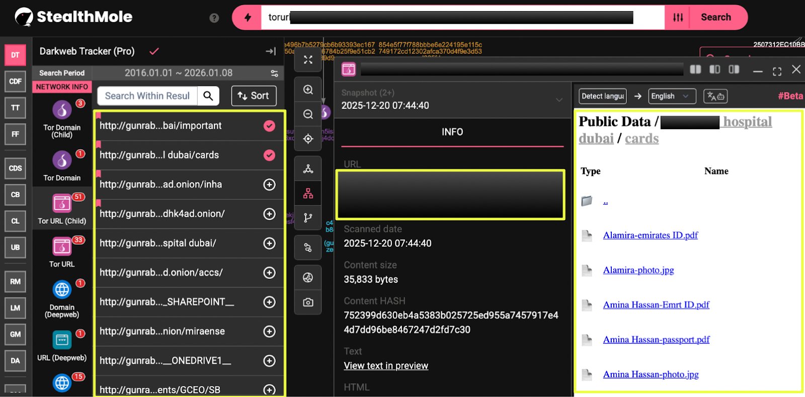 Among the 22 identified victims, a Dubai Hospital stood out due to the nature and sensitivity of the exposed data. Dedicated directories hosted on Gunra’s infrastructure contained a range of files associated with the hospital.