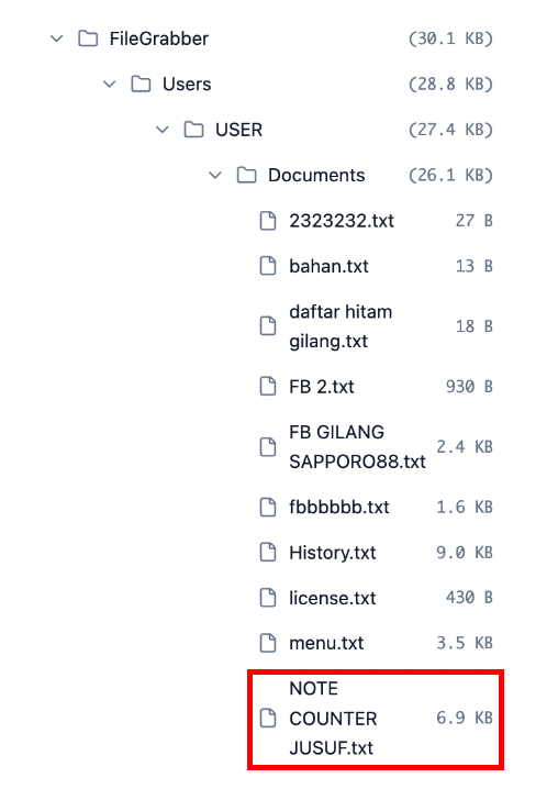 The CDS collection also included local user files extracted from the machine. While many appeared related to Facebook account management, one file stood out: NOTE COUNTER JUSUF.txt, a 6.9 KB plain-text document.