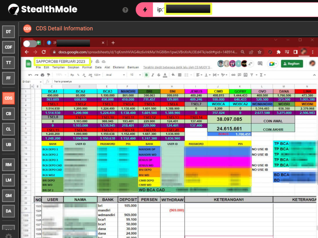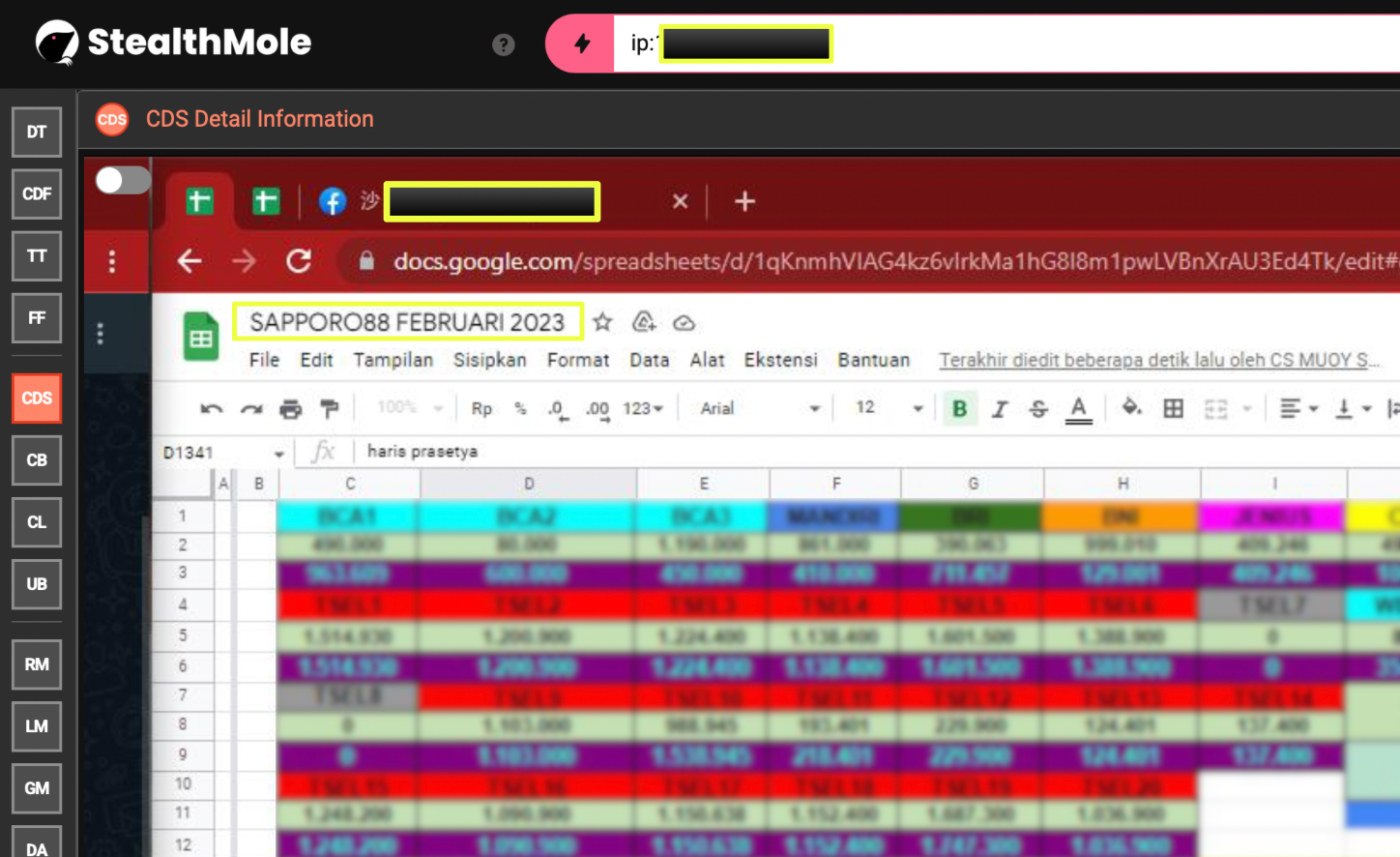 In addition to WhatsApp and Telegram, the compromised host also showed an active Facebook account session during operational activity. CDS screenshots captured the user logged into Facebook while simultaneously accessing internal financial records stored in a Google Sheets document titled “SAPPORO88 FEBRUARI 2023”.