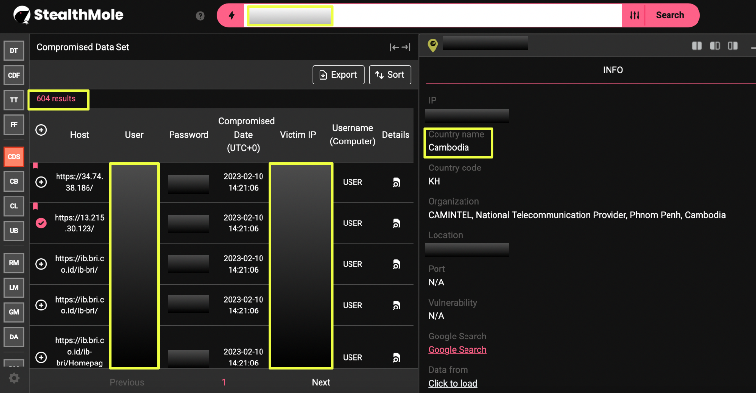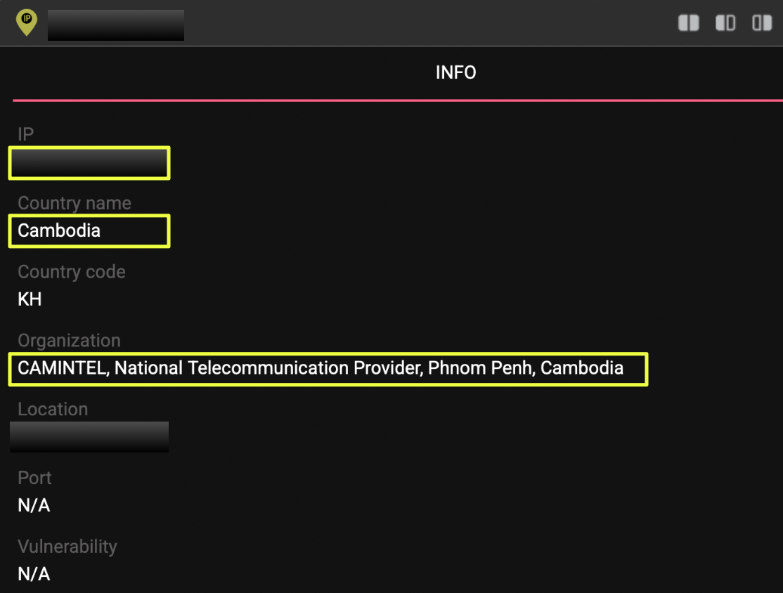 The IP address identified was 1**.*1.1*4.***4, which StealthMole geolocation data estimates to be located in Cambodia, with attribution to CAMINTEL, National Telecommunication Provider, Phnom Penh. This IP served as the primary analysis target for the case.