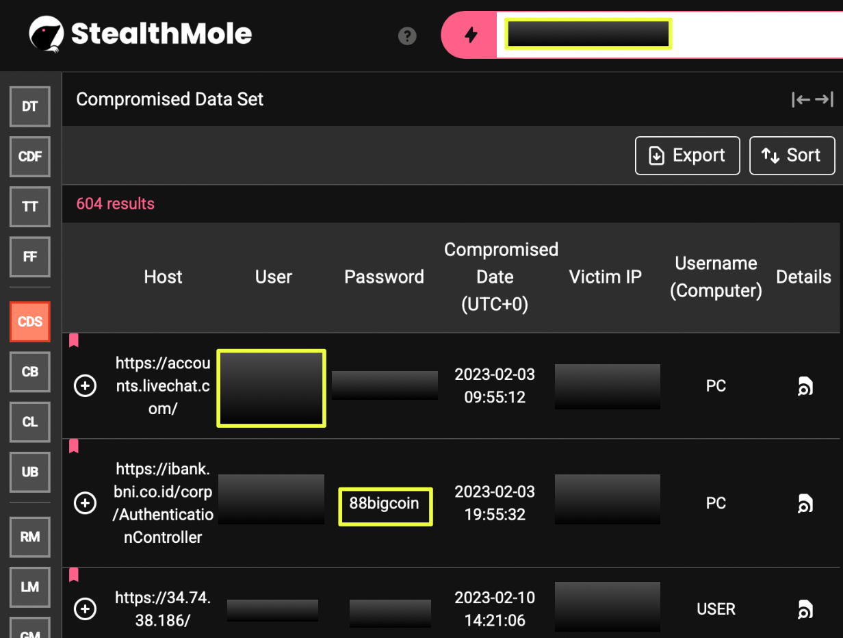Further analysis of the same IP address (1**.*1.**4.**4) within StealthMole’s CDS revealed additional compromised data records. These records referenced a user with the computer username “PC”, along with email and password artifacts containing the string “bigcoin88”.