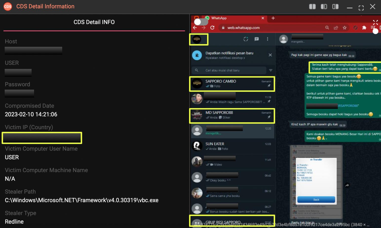 Beyond platform and financial management, CDS screenshots also captured the operator actively handling customer communications. WhatsApp Web was open on one of the screens, with visible chat logs involving Indonesian users. The presence of +62 country codes across contacts confirms that the primary customer base was located in Indonesia.